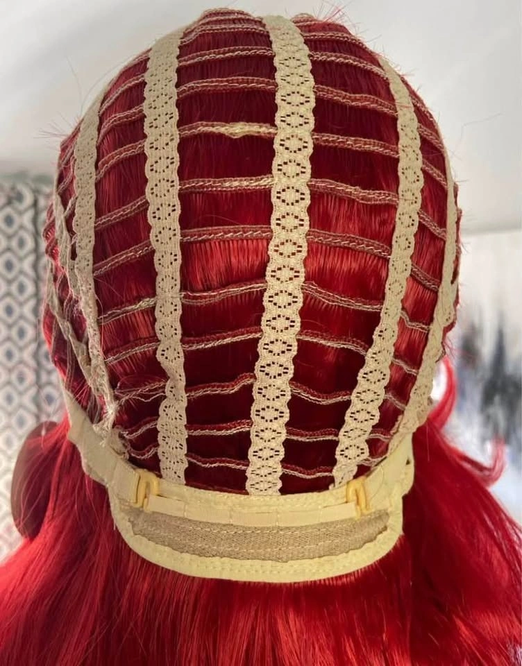 28 inches long, layered, bright red, straight parting w/ chunky long bangs