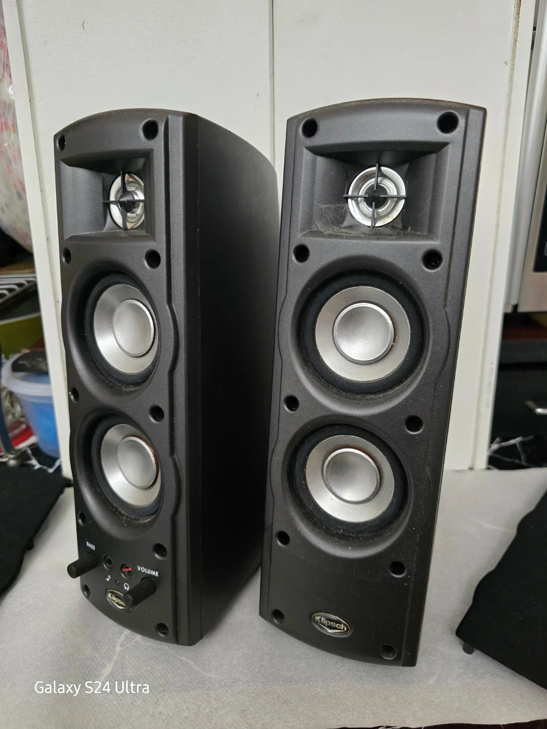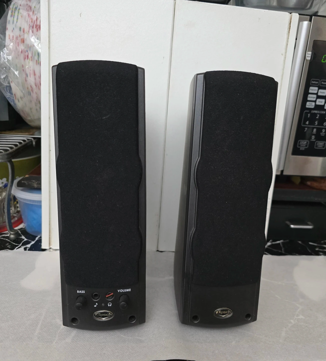 The Klipsch ProMedia Ultra 2.0 is a high-performance 2.0 multimedia speaker system designed for desktop use, featuring MicroTractrix Horn technology for clear audio, dual 2.5-inch drivers, and 30W RMS power. Despite being a discontinued, compact, sub-less system, it delivers balanced sound with good,, well-defined bass for, close-range listening, featuring built-in volume/bass controls, a headphone jack, and an aux input.