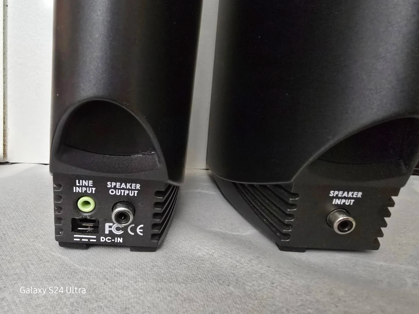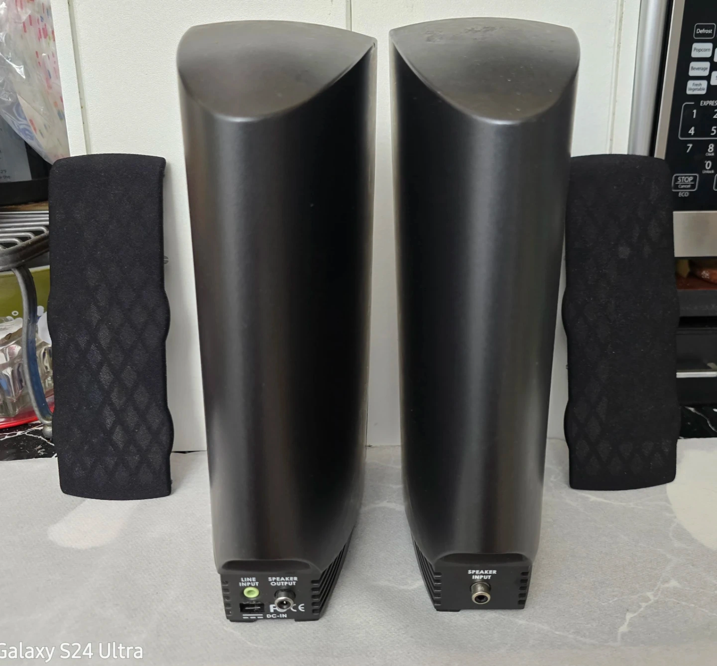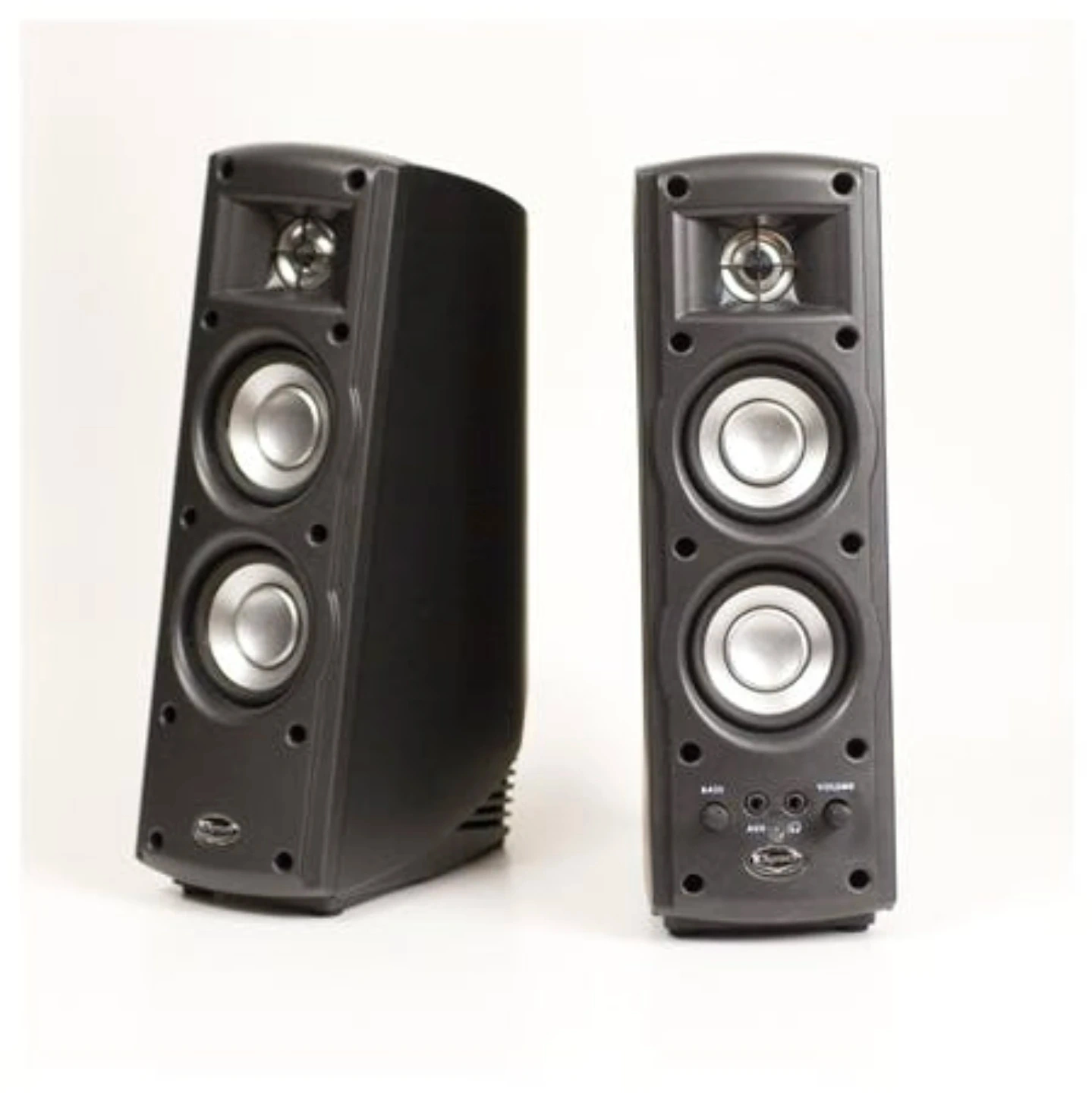 Design: Each, 10.5-inch-high tower includes removable grilles, and one speaker acts as the control unit for volume and bass adjustments.