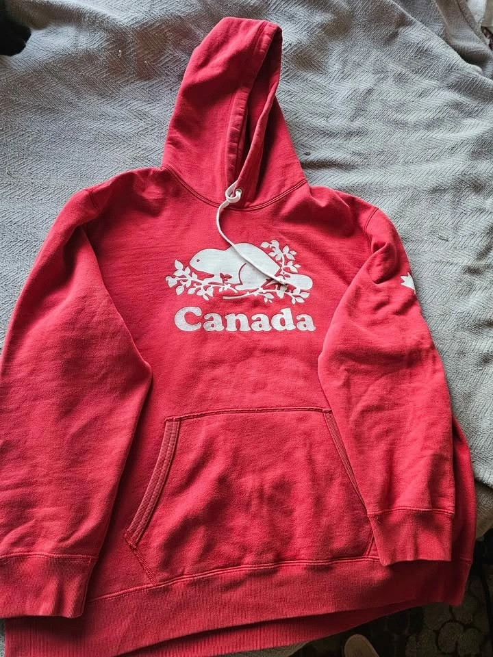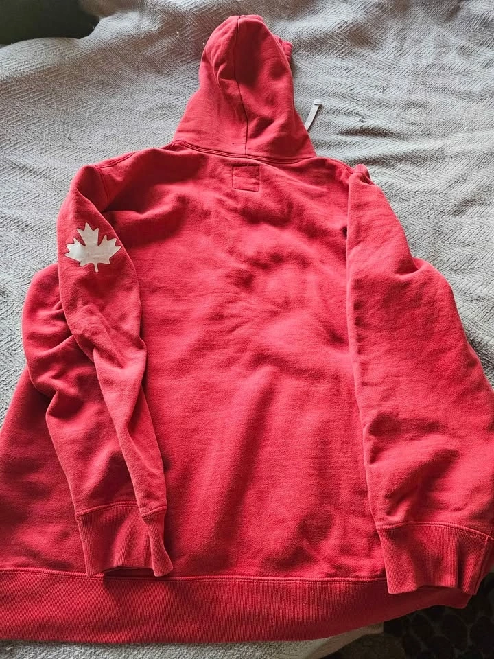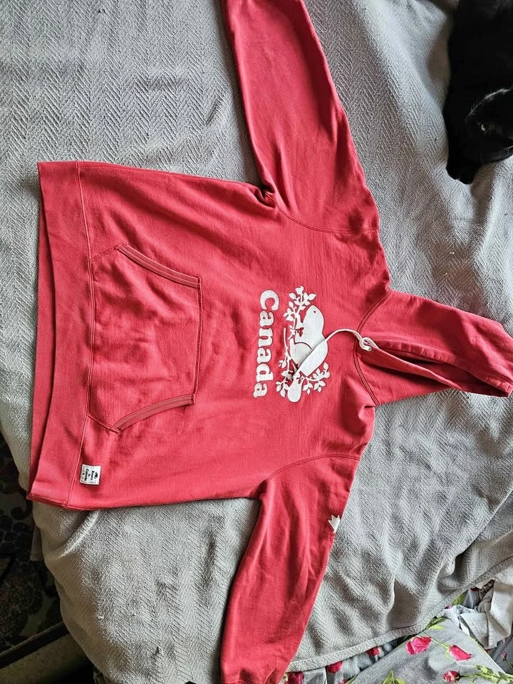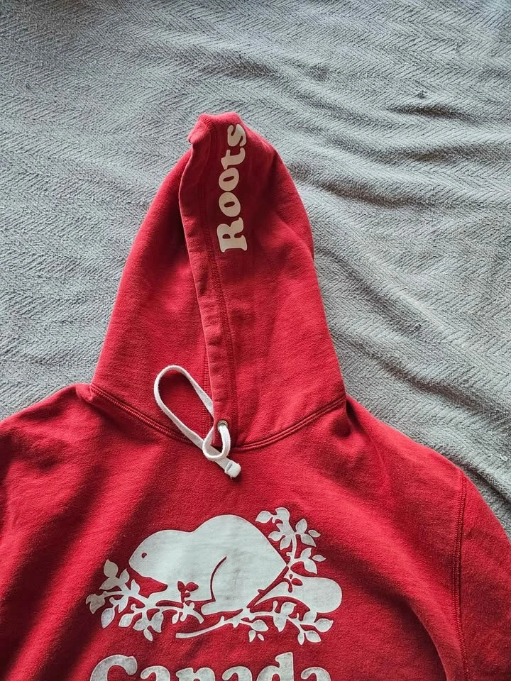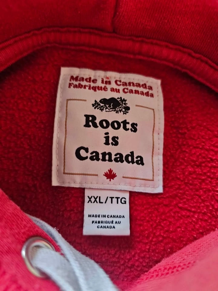 Comfy red Roots Canada hoodie with the classic beaver logo and 'Canada' text on the front. Size XXL. Made in Canada. Features a front pocket and drawstring hood.