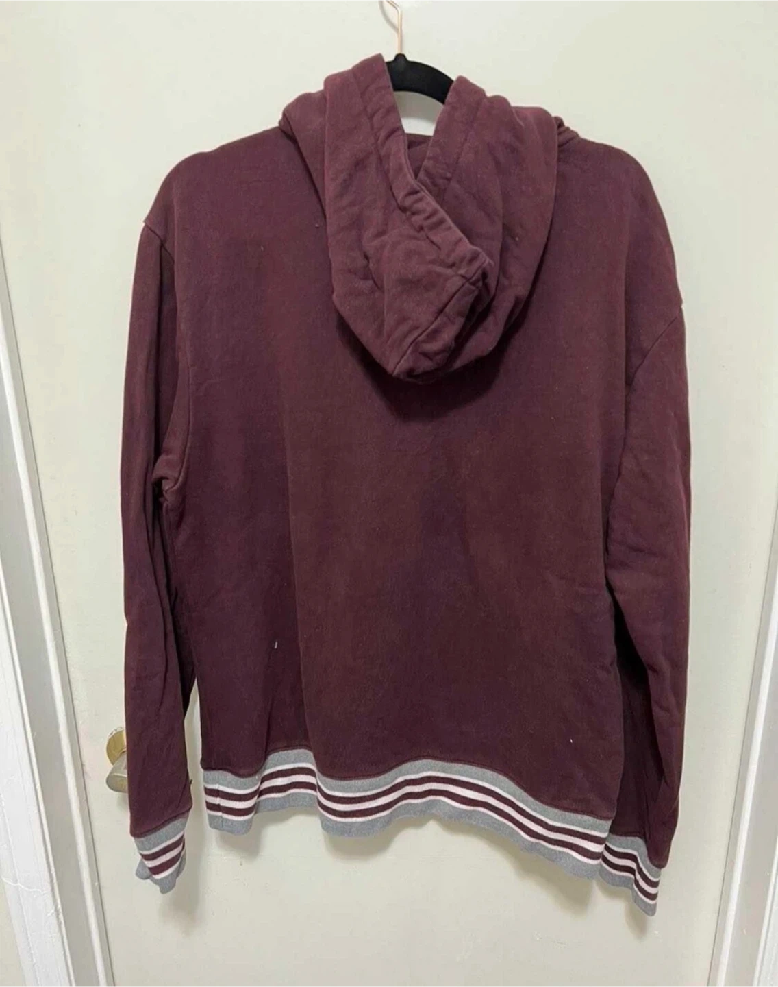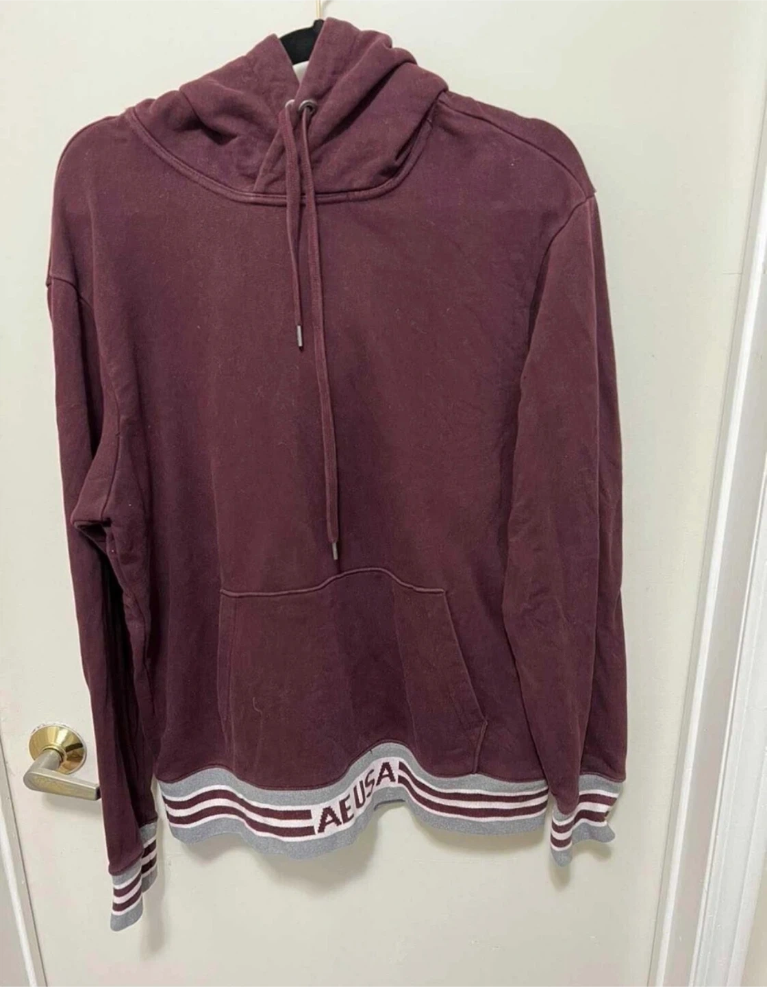 This is an American Eagle hoodie in a burgundy colour. It's a size medium with ribbed cuffs and hem featuring a grey and white stripe detail. Cotton blend material.