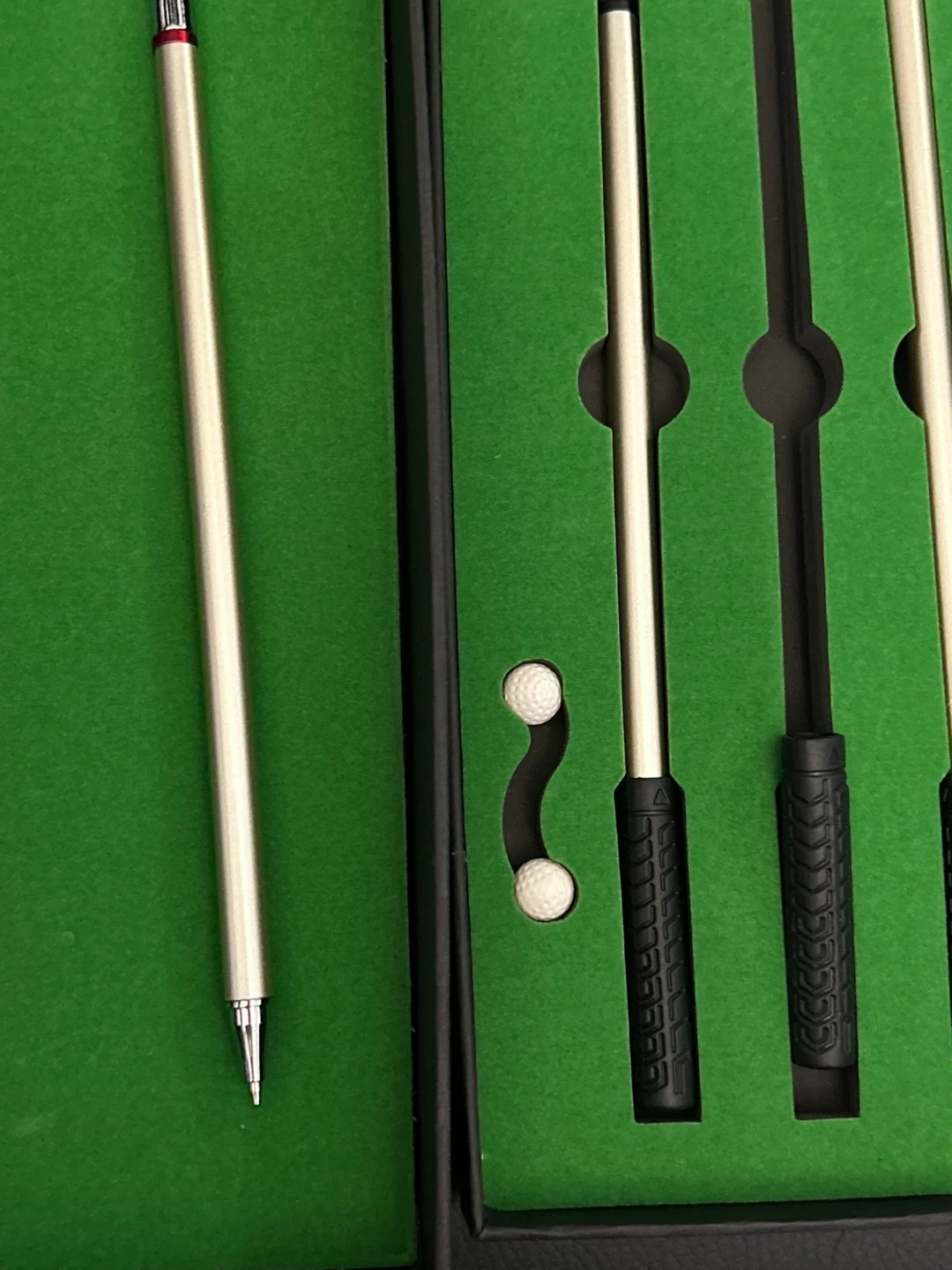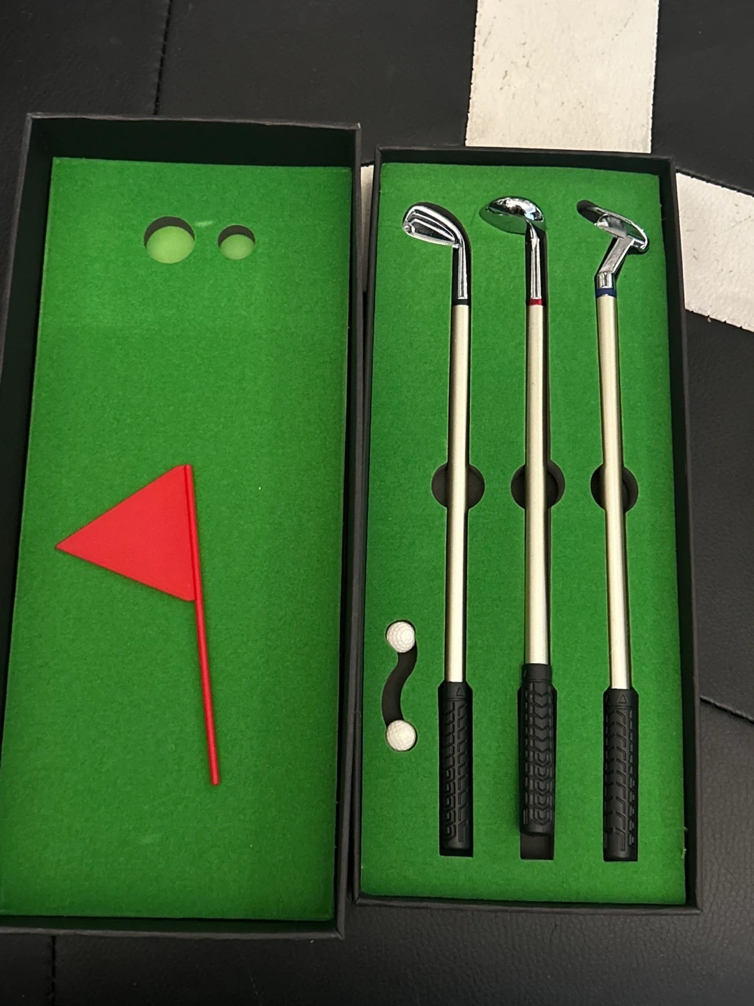 This fun golf club pen set comes in a cool case! It includes three golf club-shaped pens and two mini golf balls. Perfect for any golf enthusiast or a unique desk accessory