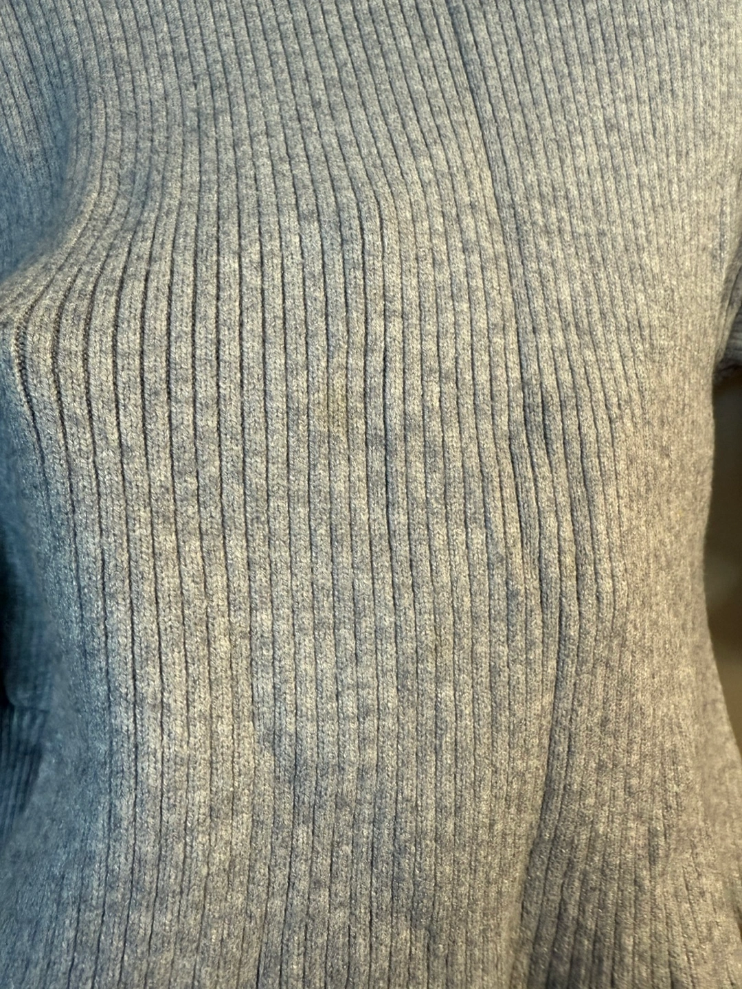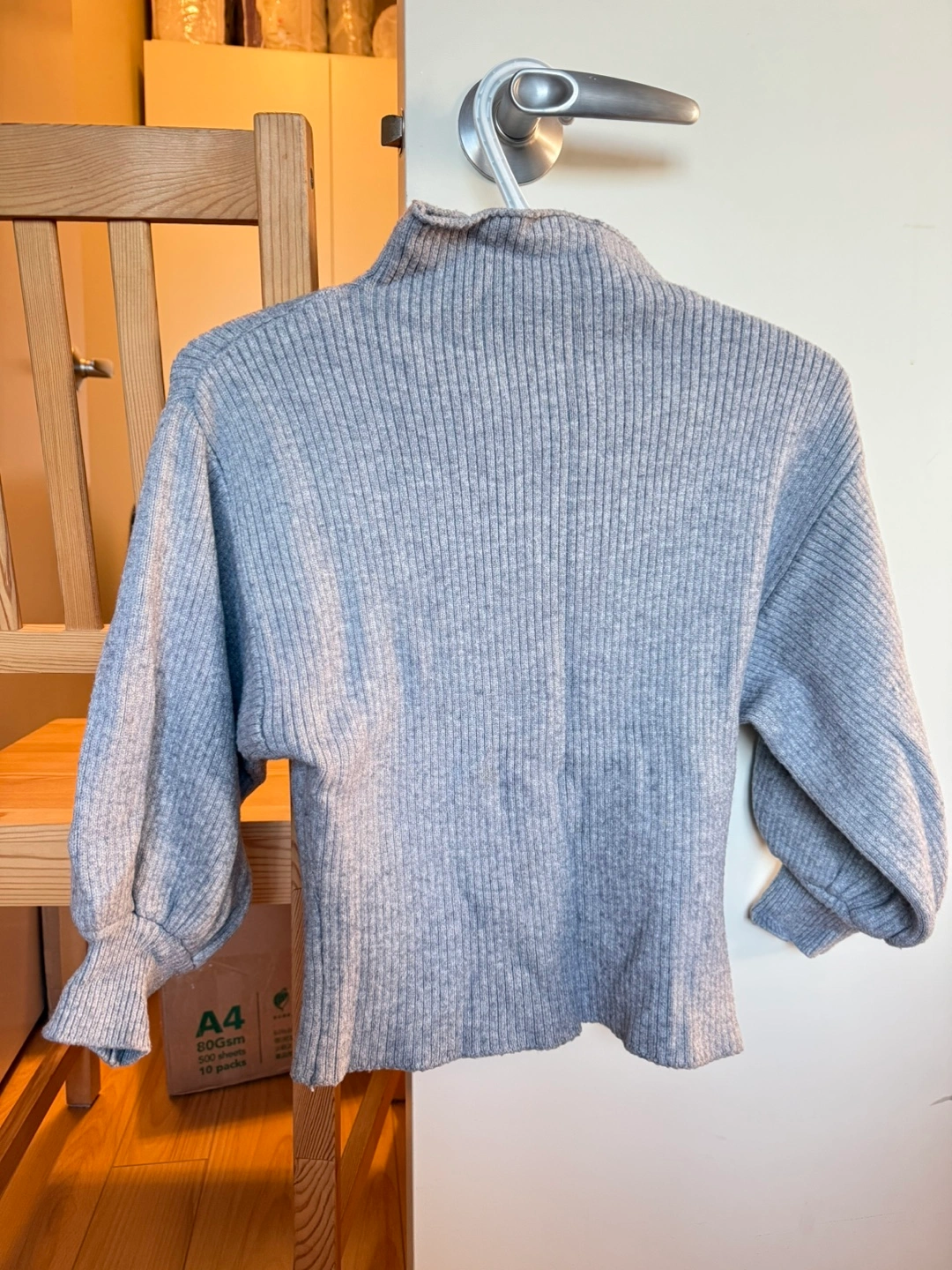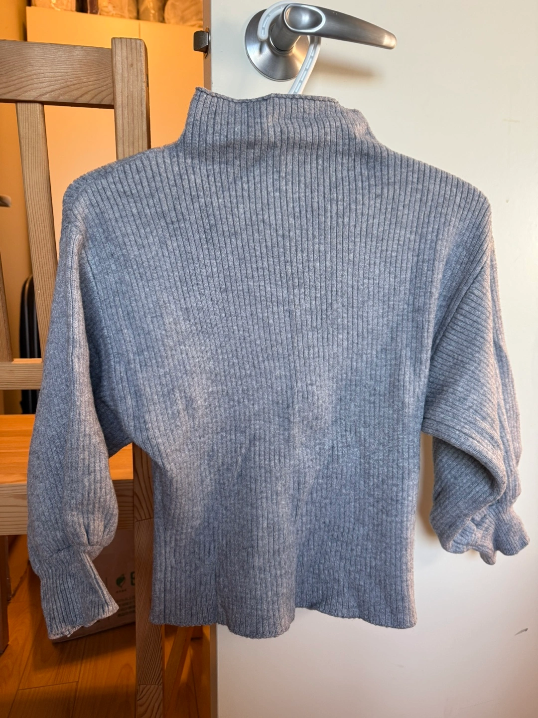 Lightweight grey ribbed knit sweater. Mock neck, three-quarter sleeves. Slight puff sleeves. Relaxed fit.