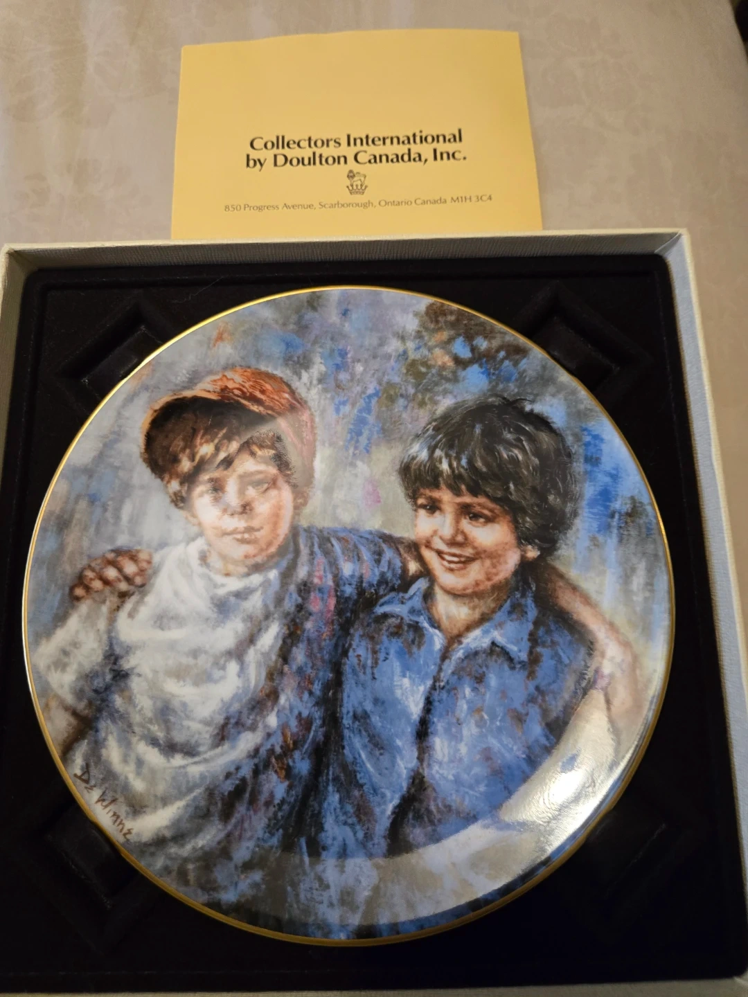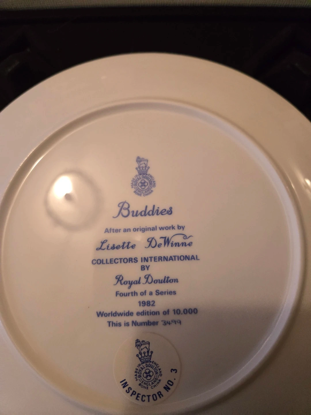 This is the fourth in a series of collector plates, worldwide edition of 10,000. The plate depicts "Buddies", an original work by Lisette De Winne. It's made of fine bone china. The original box is included.