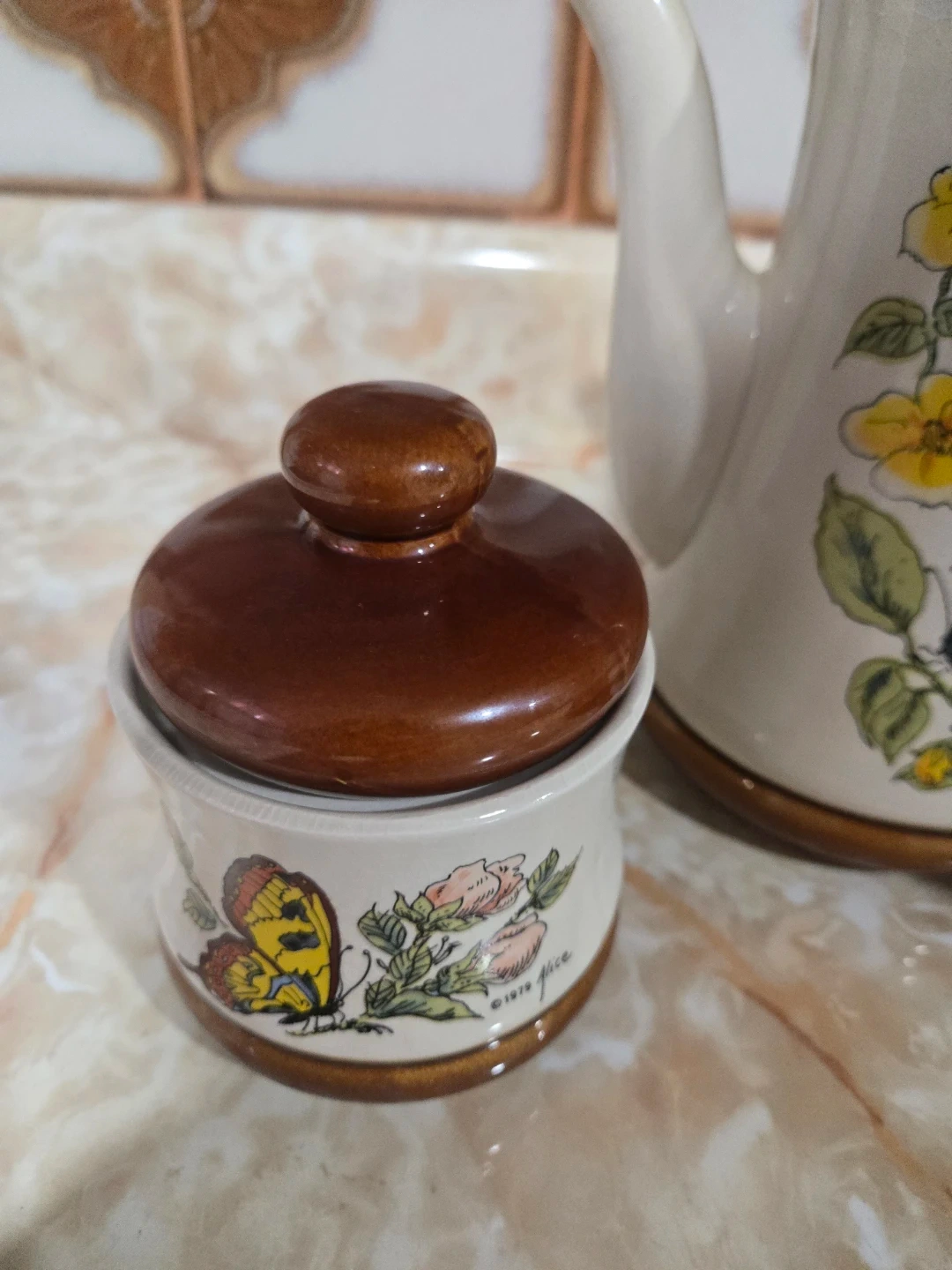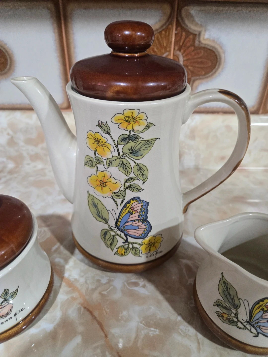This charming ceramic tea set includes a teapot, sugar bowl, and creamer, all adorned with a lovely floral and butterfly design. The pieces feature brown lids and accents, with visible text indicating '1979 Florence'. It's a delightful addition to any kitchen. Made in Japan. Pickup only mississauga $10 firm.