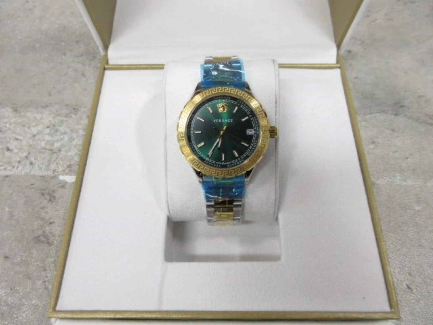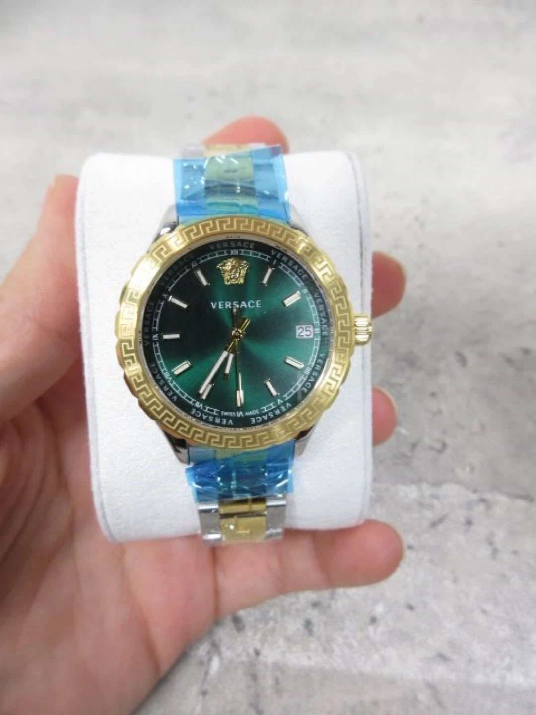 I'm selling this new Versace Hellenyium Two-Tone Watch with a striking green dial and a two-tone steel strap. This watch combines luxury and style, making it a standout accessory. The watch is new, never been used. It comes with its original box.