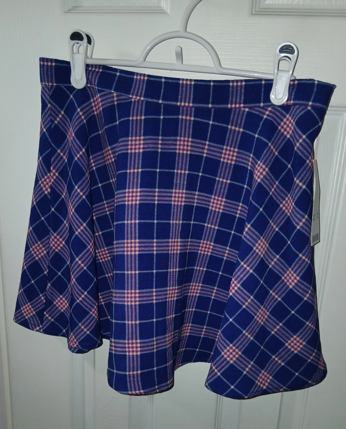 This is a blue plaid skater skirt from Urban Outfitters, in size medium. The fabric feels soft and it has a nice flowy silhouette. Great for pairing with sweaters or blouses!