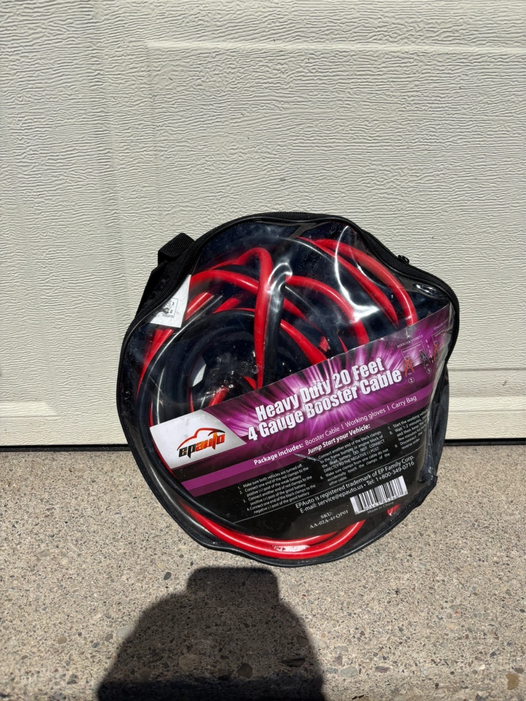 Heavy duty 20 ft, 4 gauge booster cable set in a convenient carry bag. Includes working gloves. Essential for jump-starting a vehicle. Make sure to follow the included instructions for safe use.