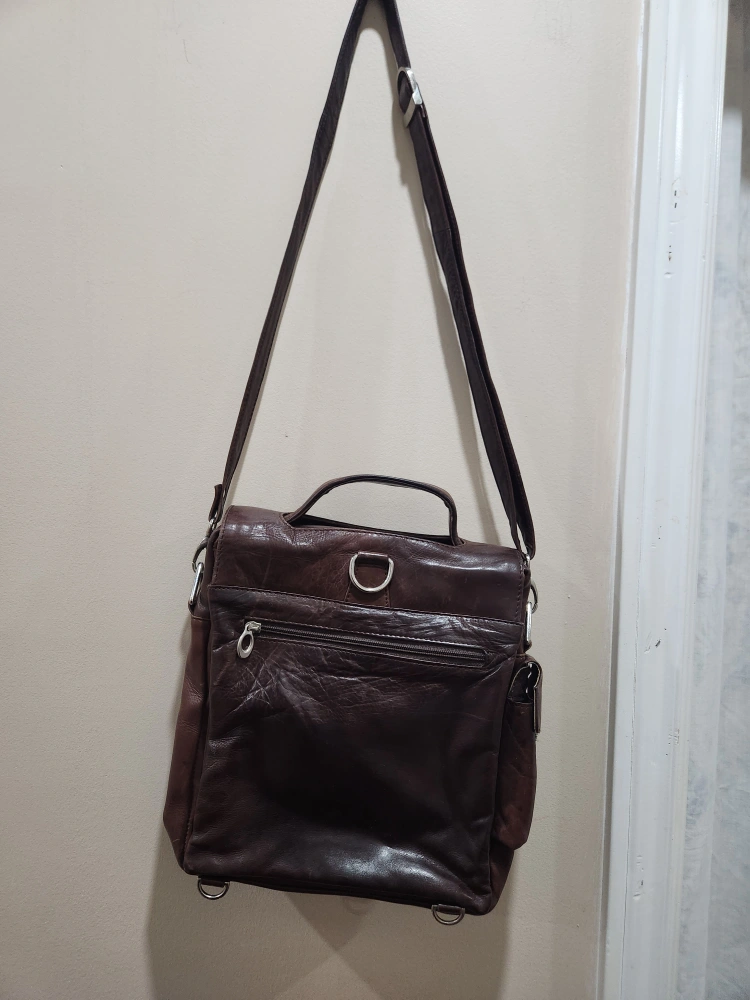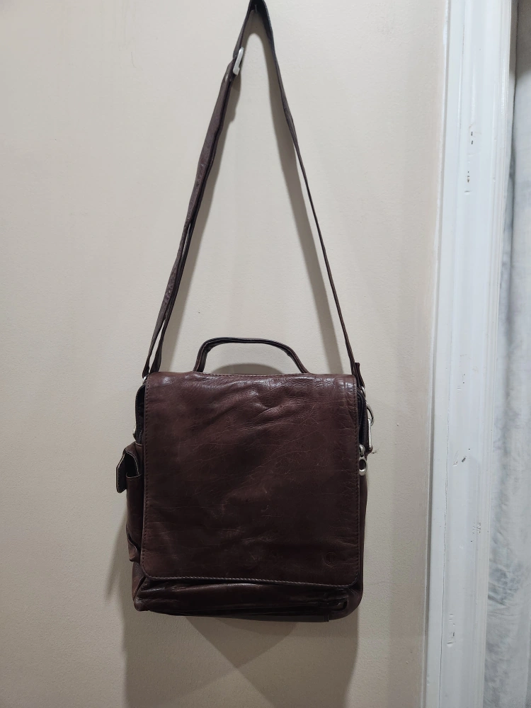 Dark brown leather satchel. Adjustable shoulder strap. Multiple compartments and pockets. Top handle. Good for work or everyday use.