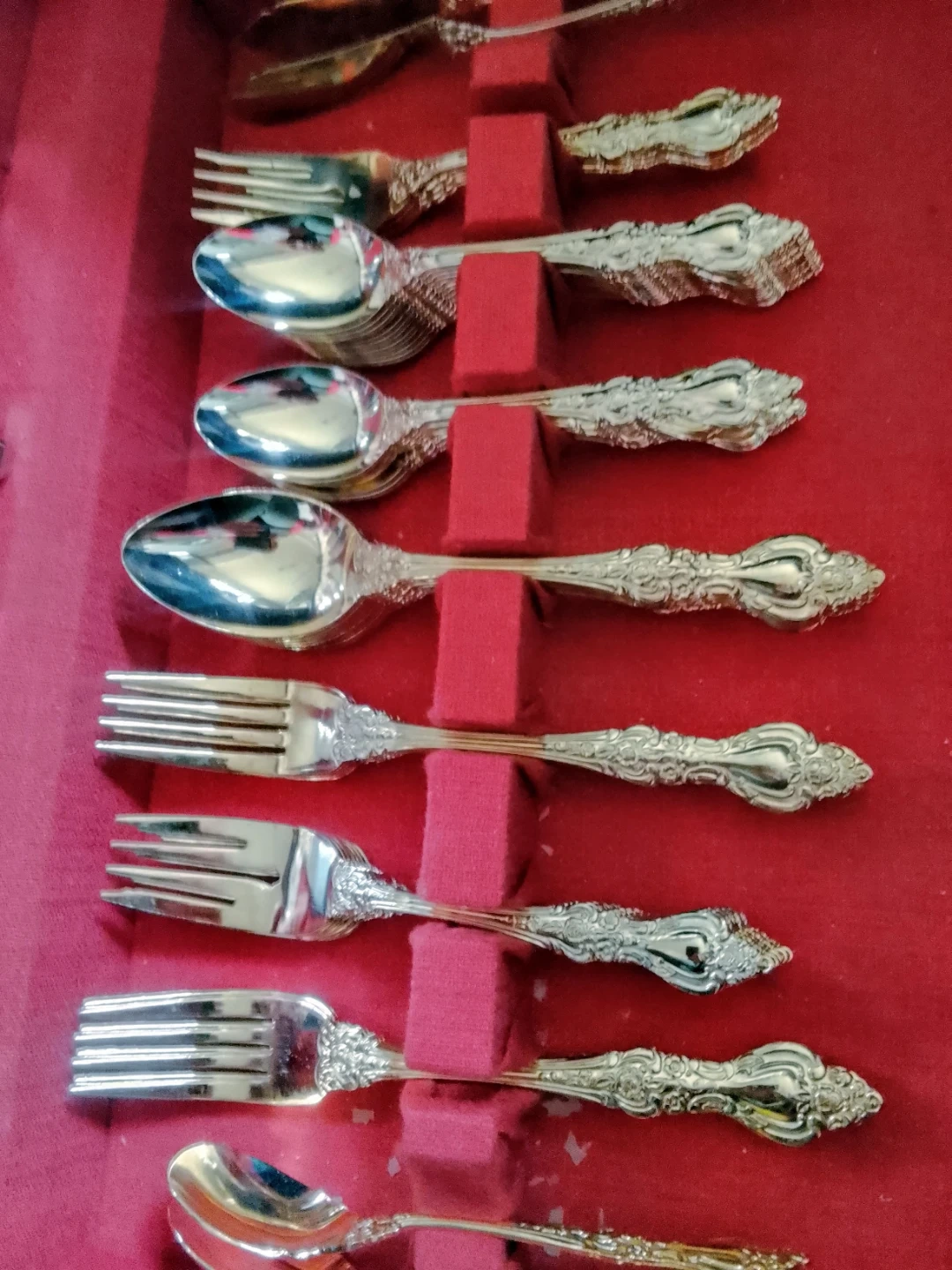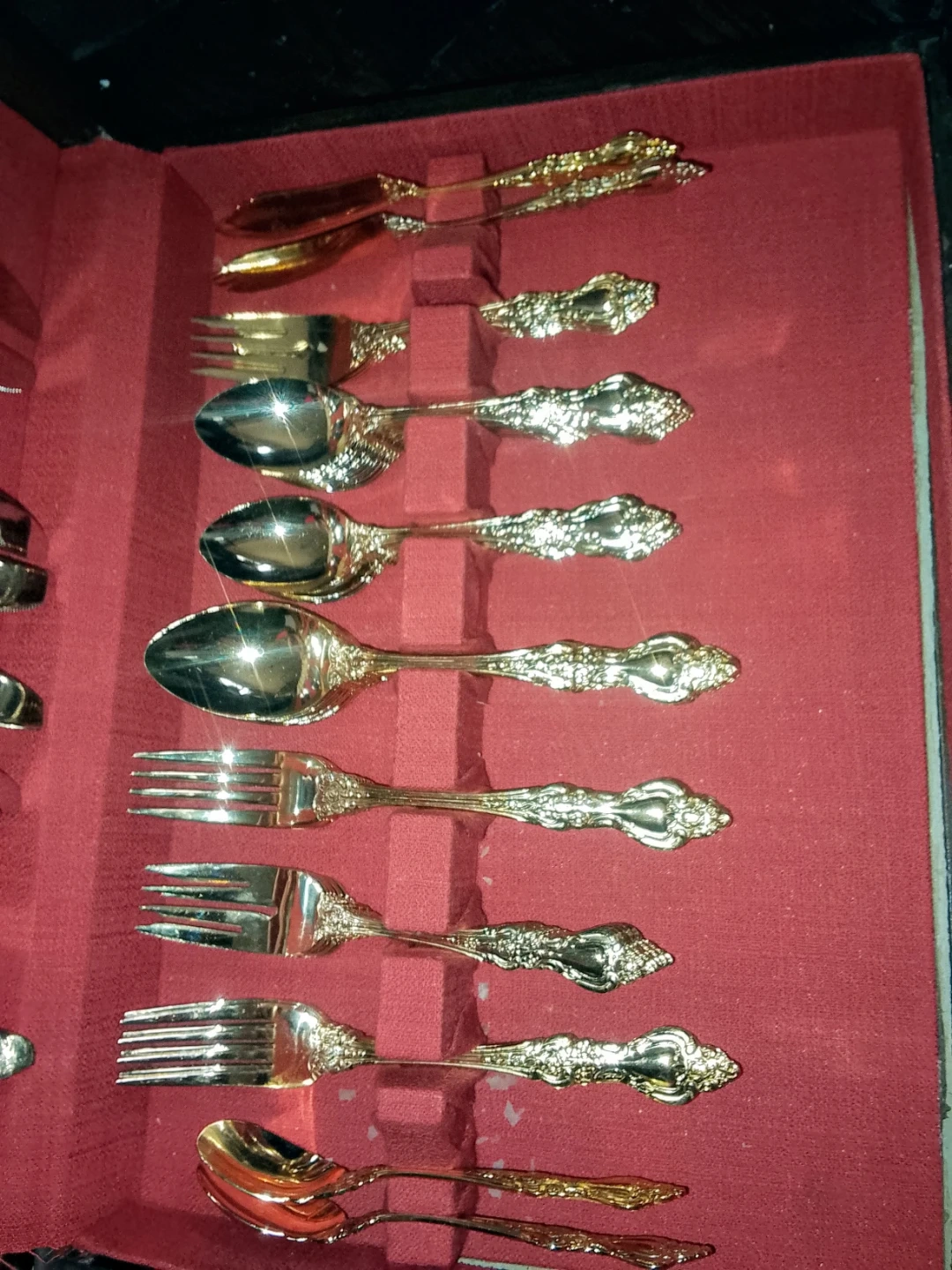 Beautiful ornate gold plated cutlery set in a red velvet lined case. It's a full set with multiple forks, spoons, and knives, each with an intricate floral pattern. Perfect for special occasions or to elevate your dining experience!