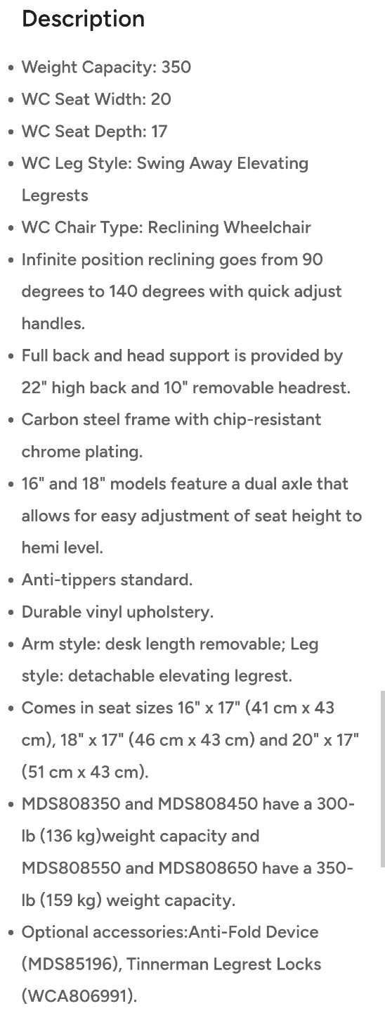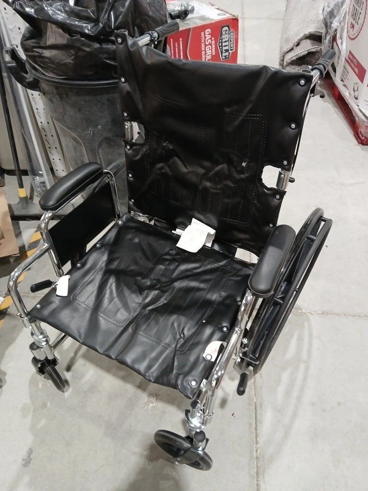 This is a new Medline Excel reclining wheelchair, designed for comfort and support with a weight capacity of 350lbs. πͺβΏ It features a 22-inch full back with a 10-inch removable headrest, allowing for infinite reclining positions from 90 to 140 degrees, adjustable with quick-adjust handles. πποΈ The carbon steel frame is coated with chip-resistant chrome plating, ensuring durability. π‘οΈπ It also features anti-tippers. π«π€Έ