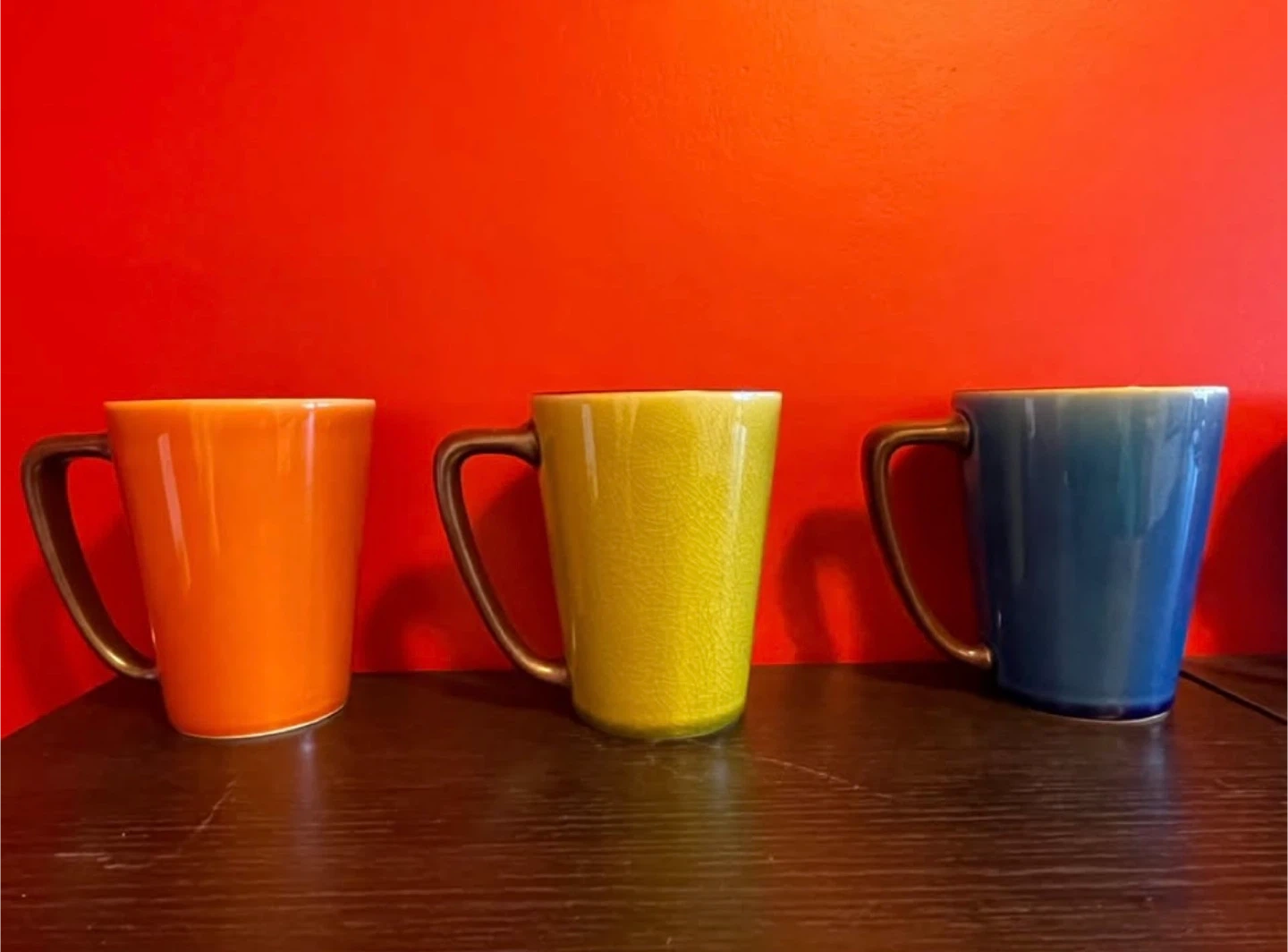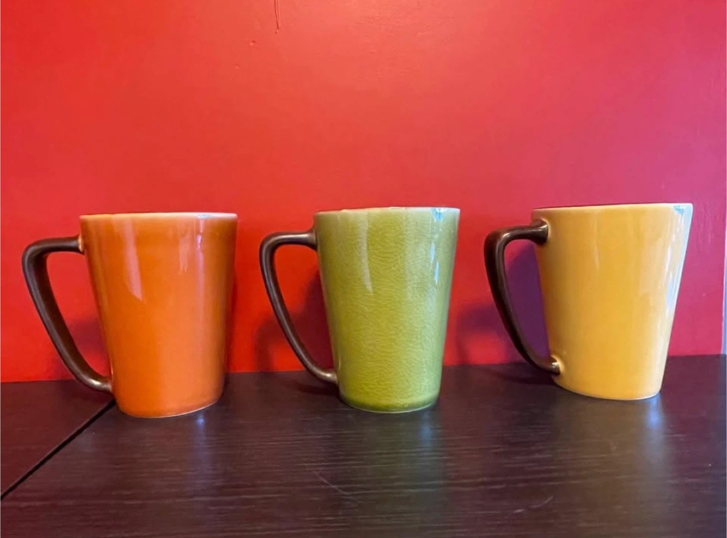 I'm selling a set of six ceramic mugs in a variety of vibrant colours. They're in great condition and ready for a new home! They would be perfect for coffee, tea, or any other beverage.