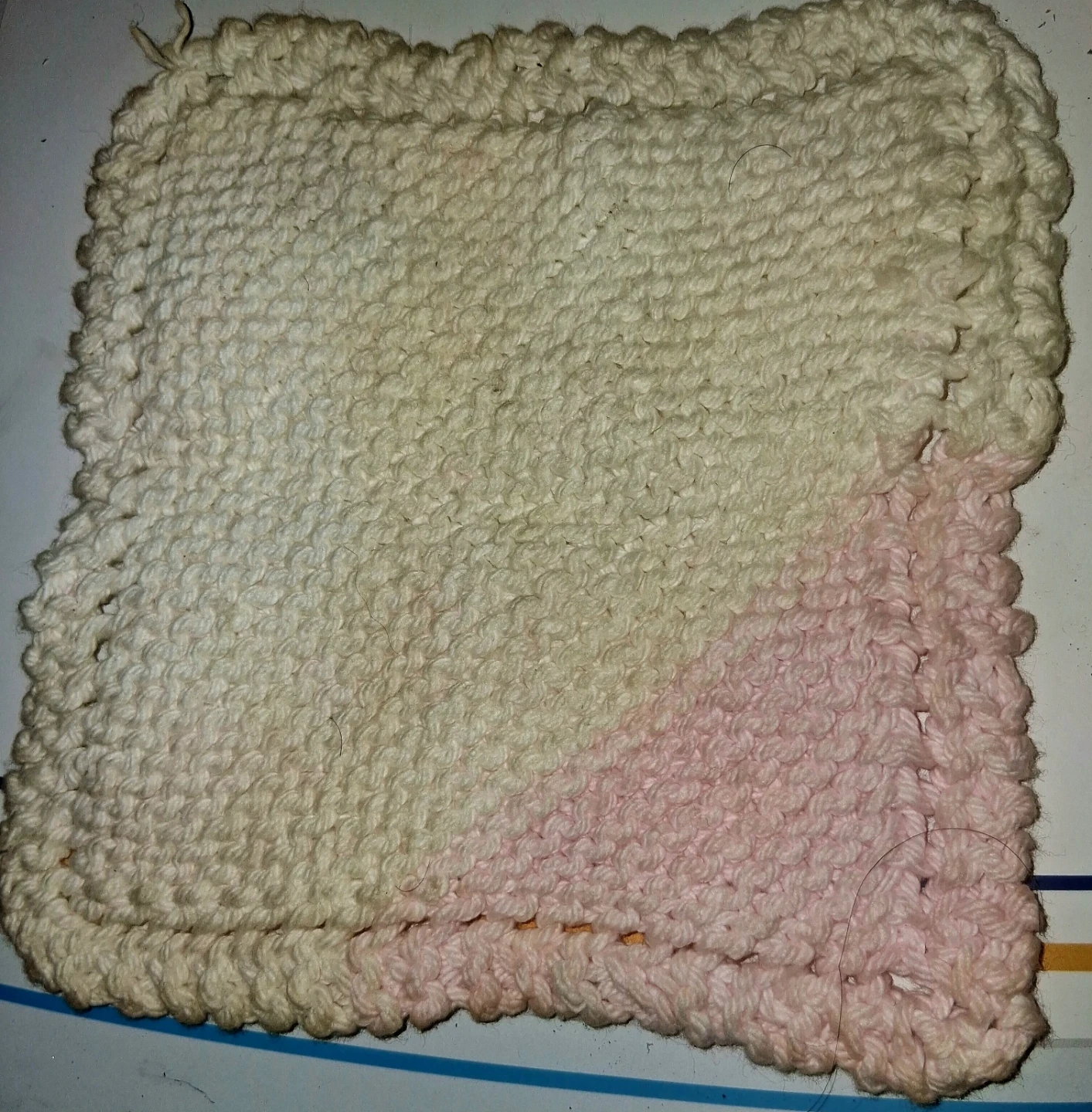 Set includes red Betty Crocker bag clips and a handmade knitted potholder. The potholder is cream and pink, with a textured knit pattern. Clips are plastic and designed for sealing bags. Pickup only unless near intersection of Oxford and Gammage Street.