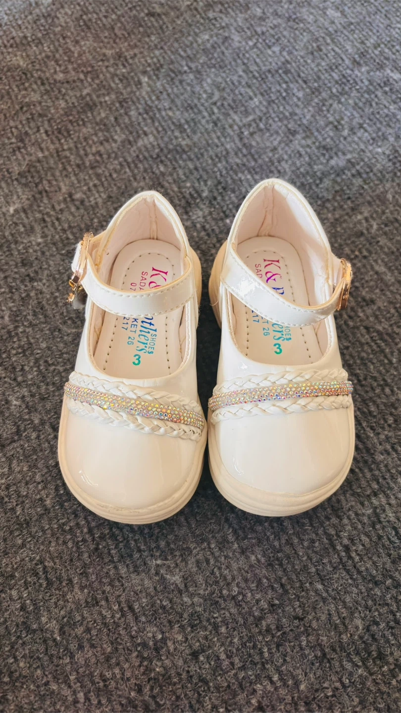 These adorable K&F dress shoes are perfect for your little one! They're a beautiful cream/off-white colour and feature a cute braided design with sparkly accents. The size is 23 (European sizing, approximately a US size 7). They are in great condition and ready for a new home!