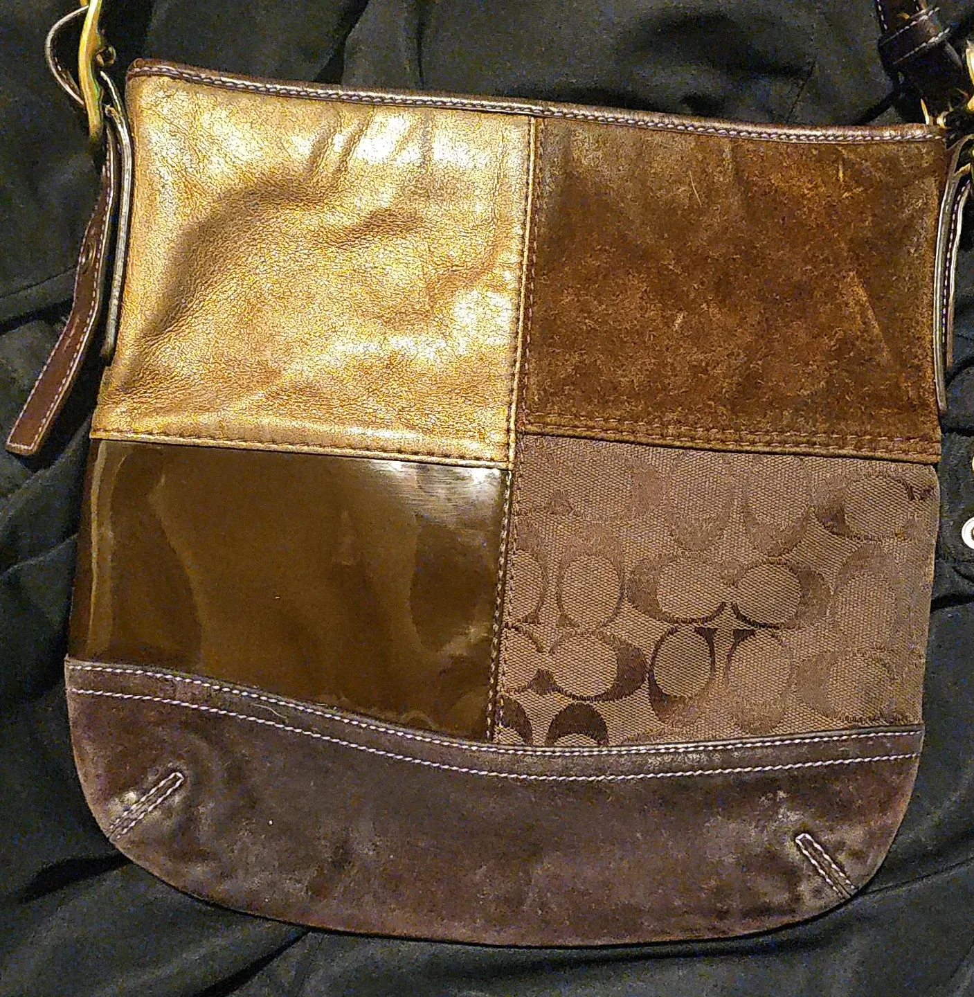Patchwork shoulder bag from Coach. Features a mix of gold metallic leather, brown suede, patent leather, and signature "C" jacquard fabric. Adjustable leather strap and silver-tone hardware.