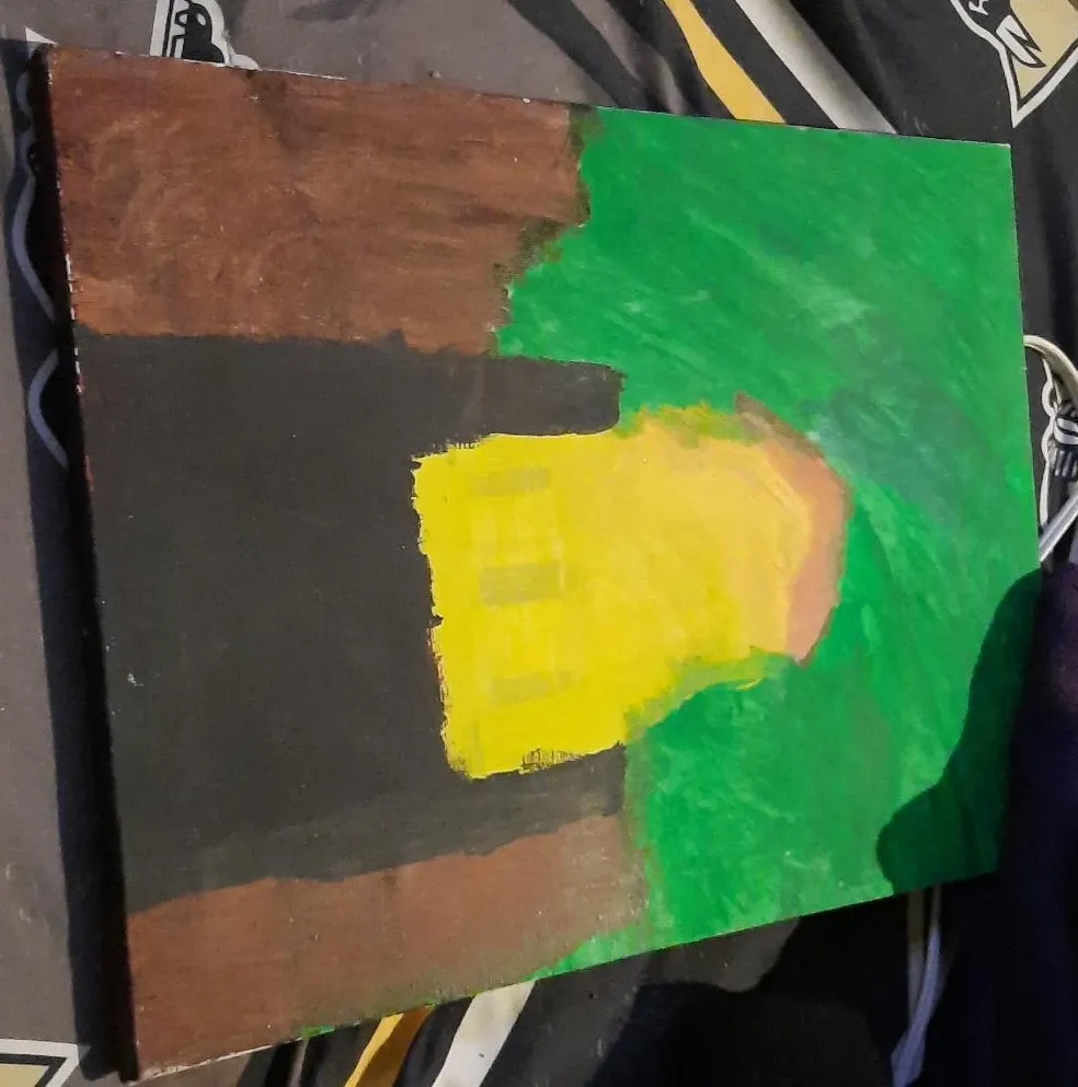 This is an abstract painting on canvas. It features bold blocks of colour including black, brown, yellow, and green. A bright yellow rectangular shape is central to the piece. It's a unique piece of wall art.