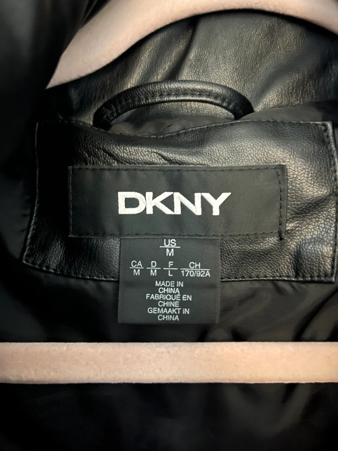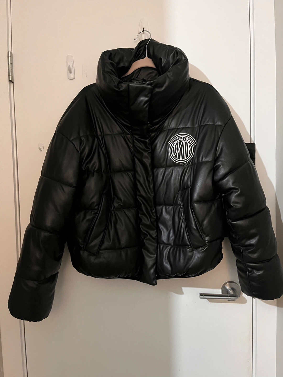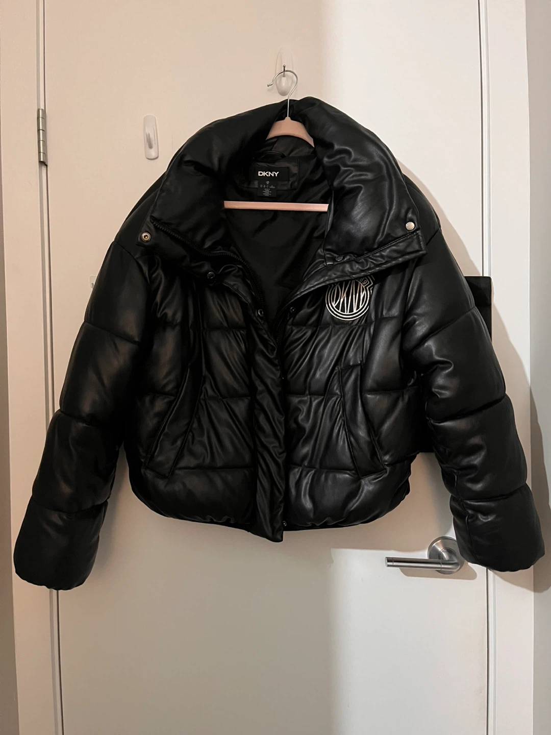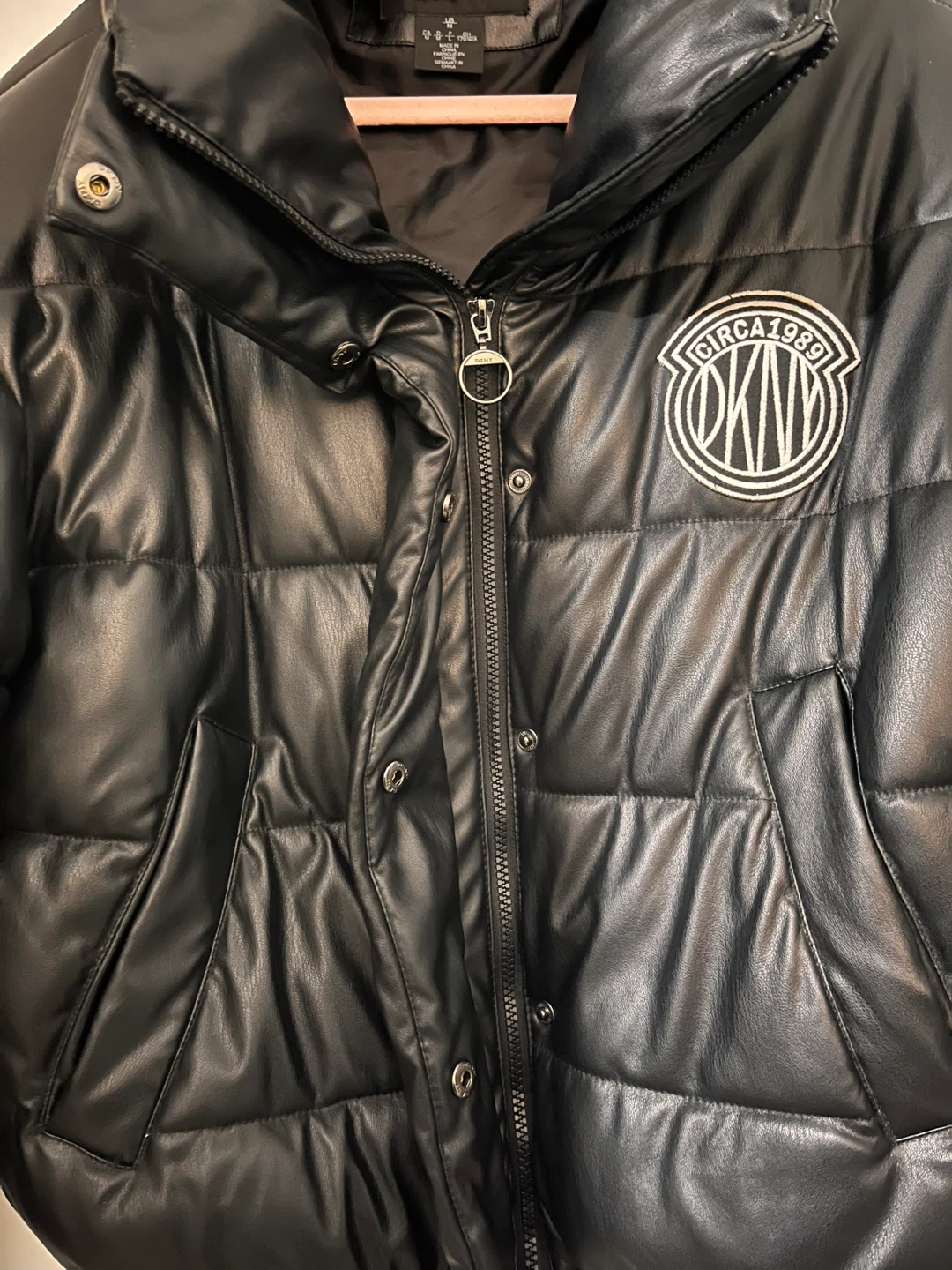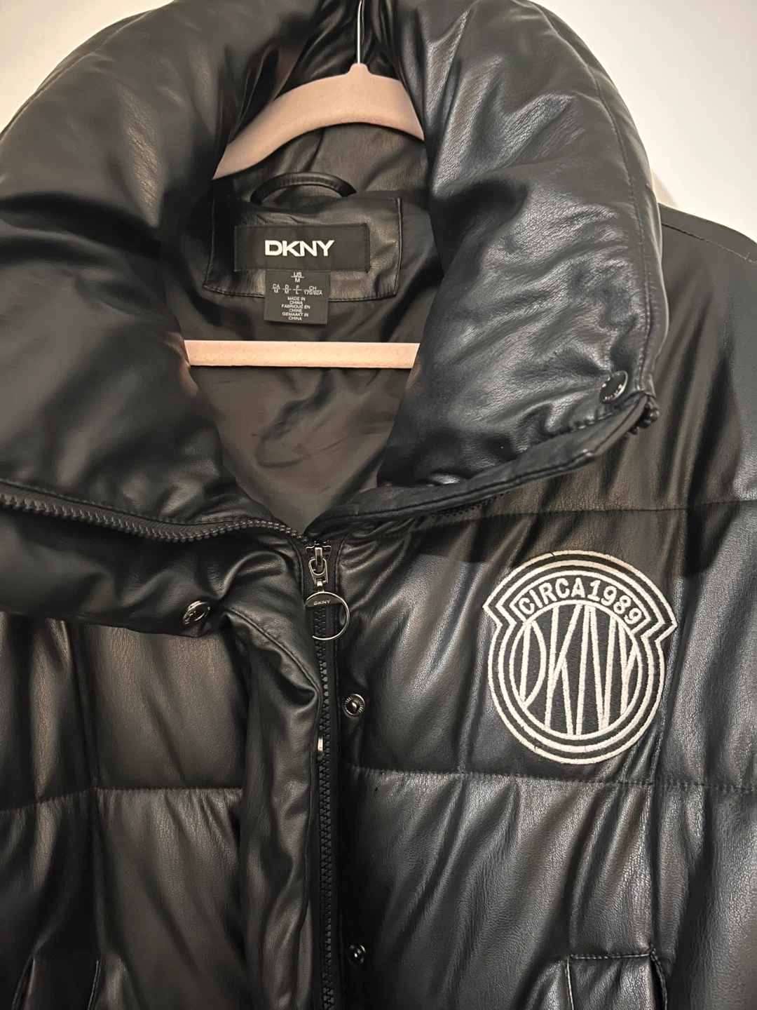 This DKNY puffer jacket is black with a faux leather finish. It's a size medium. The jacket features a high collar and a circular DKNY logo patch on the chest. It's a stylish and warm option for cooler weather!