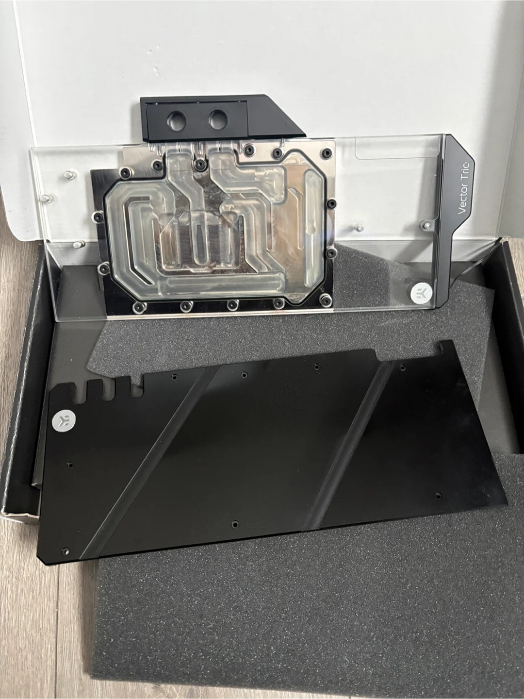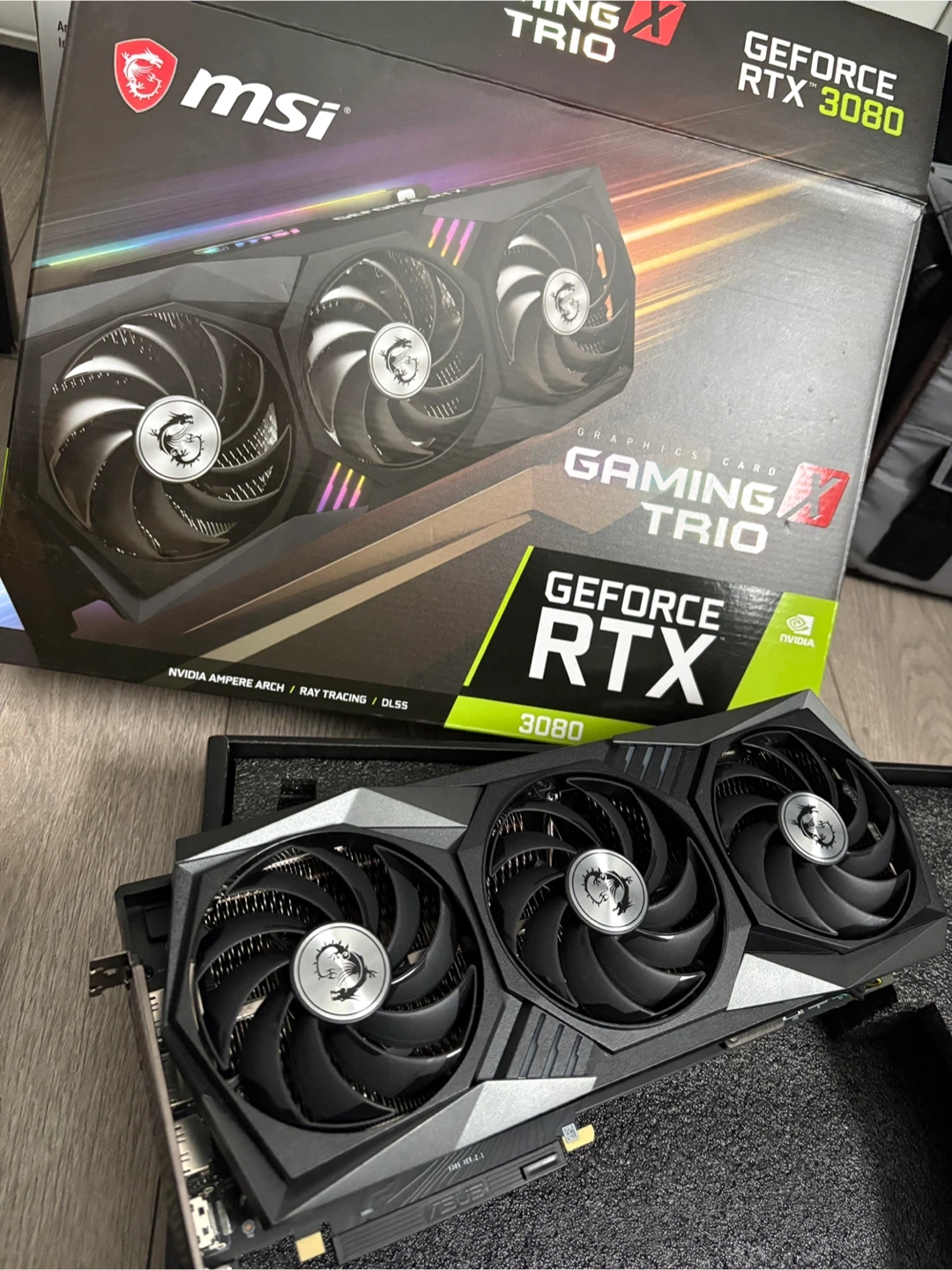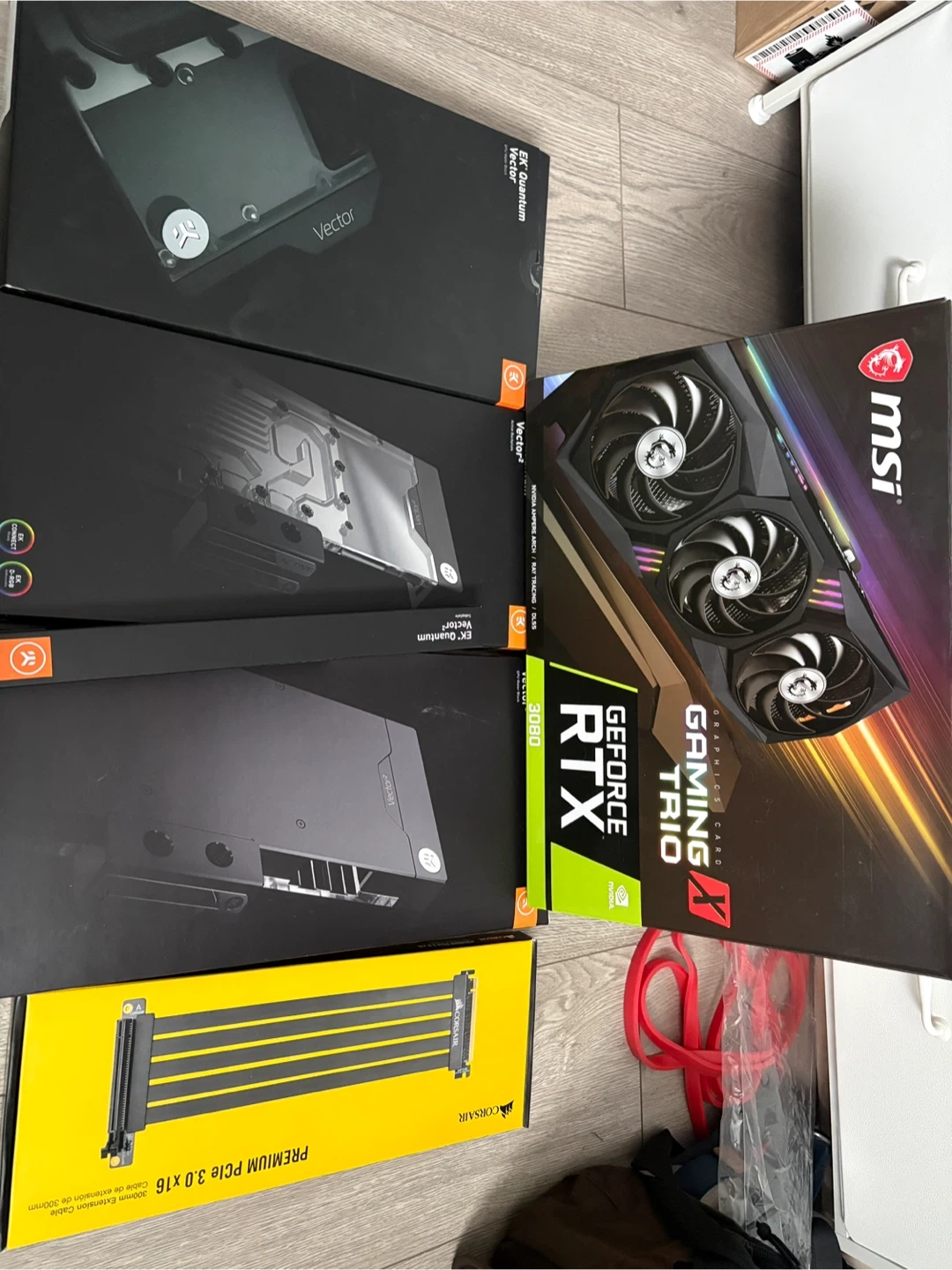 MSI GeForce RTX 3080 Gaming X Trio graphics card with original box. Includes EK-Quantum Vector Trio water block and Corsair Premium PCIe 3.0 x16 riser cable. This setup is great for high-end PC builds. It's ready for intense gaming and a great start to custom water cooling. There are 2 water blocs and an active backplate. These blocks are also compatible with the 3090 trio. Sold as a set not splitting up.