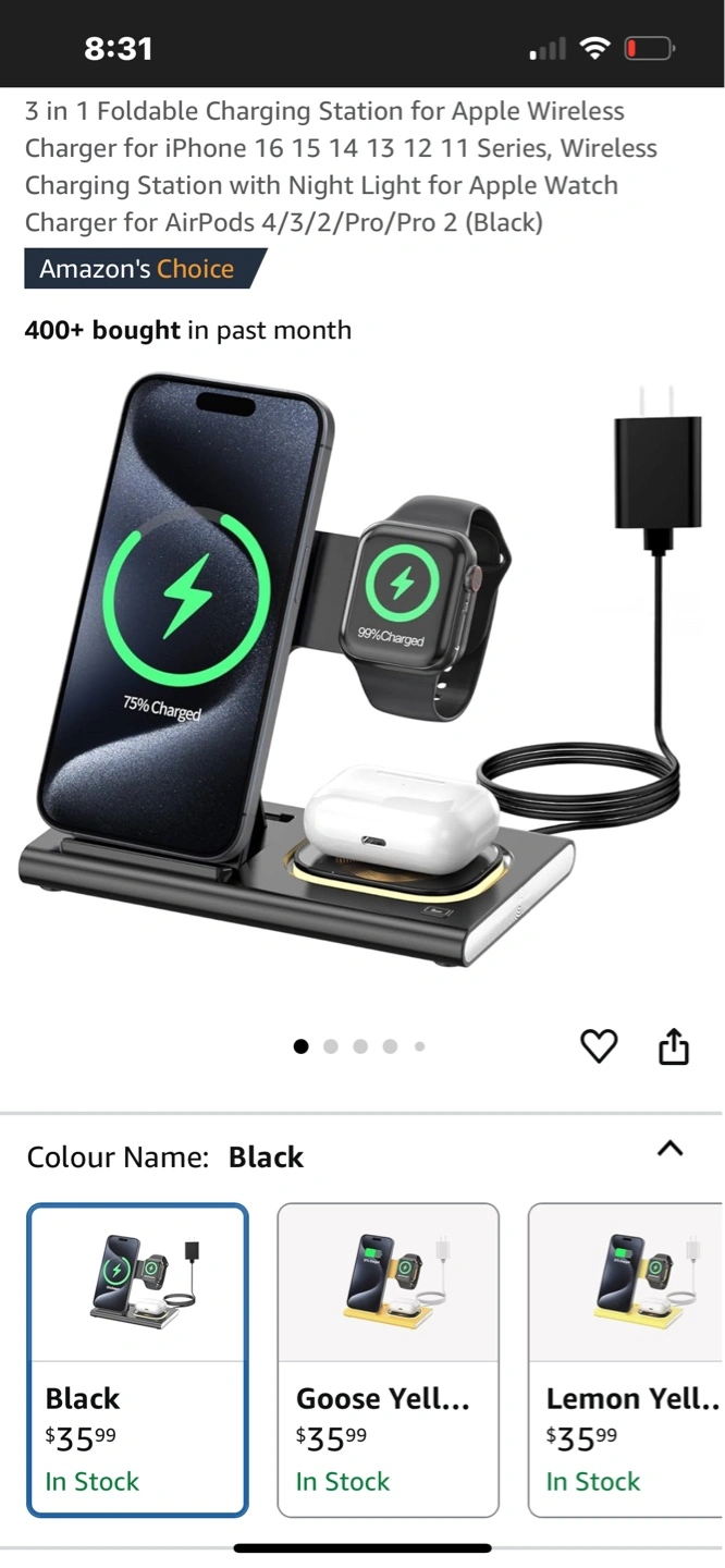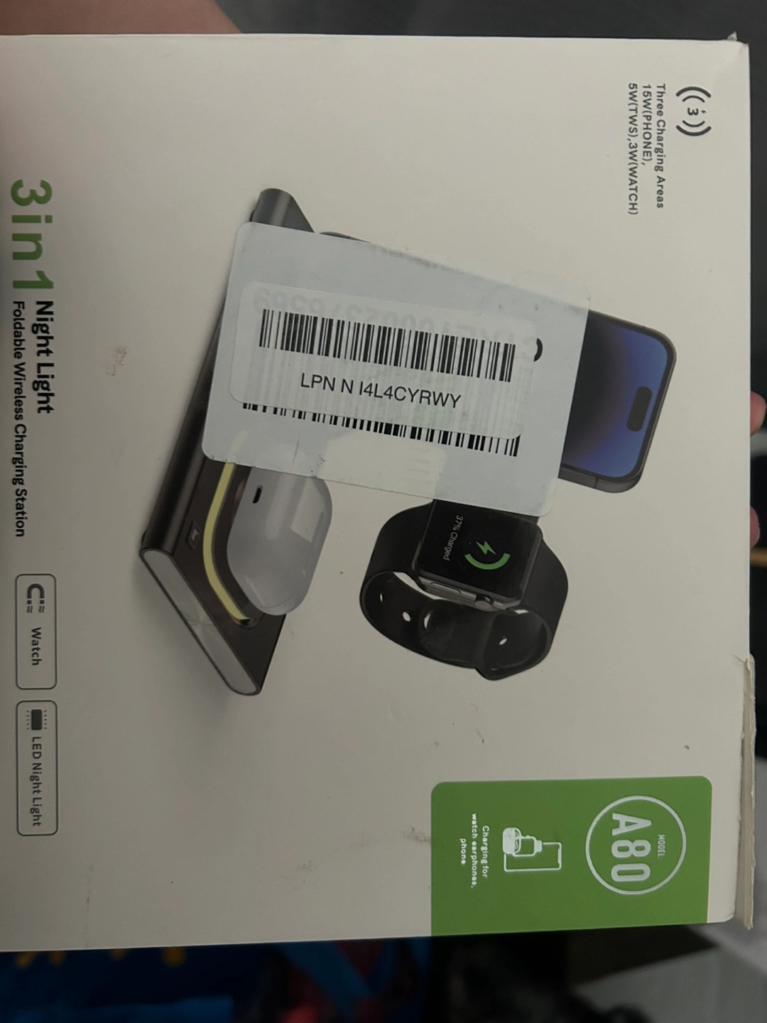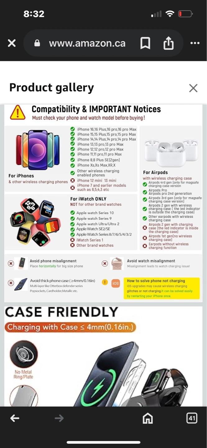Foldable charging station. Charges iPhone, Apple Watch, and AirPods. Includes a night light. Three charging areas. Compatible with various iPhone and Apple Watch models.