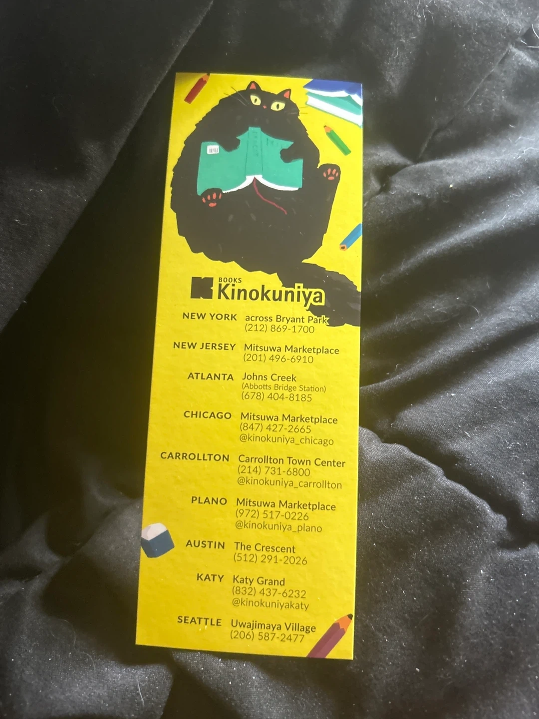 Bookmark I bought from Kinokuniya. This is a Kinokuniya bookstore bookmark featuring a black cat reading a book. It lists various store locations across the US, including New York, New Jersey, Atlanta, Chicago, Carrollton, Plano, Austin, Katy, and Seattle. A fun accessory for book lovers!