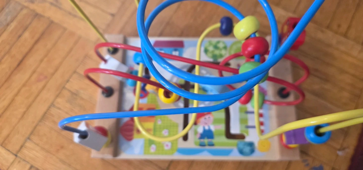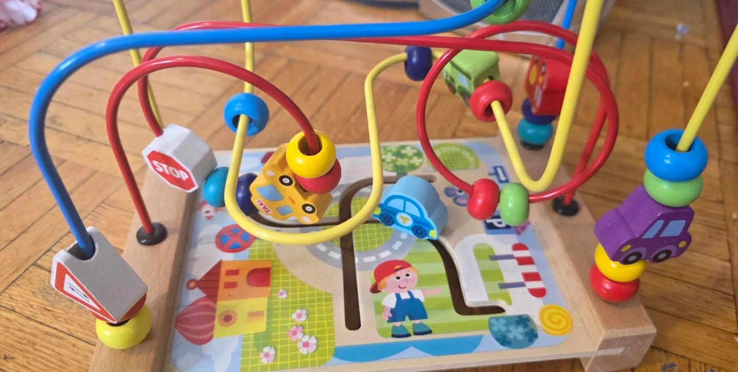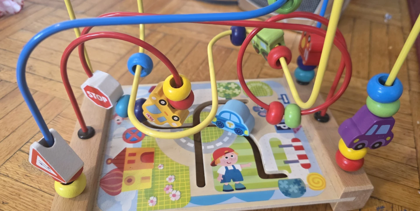 This wooden bead maze activity cube is designed for little ones. It features colourful beads, cars, and a fun playground scene. Great for developing fine motor skills!