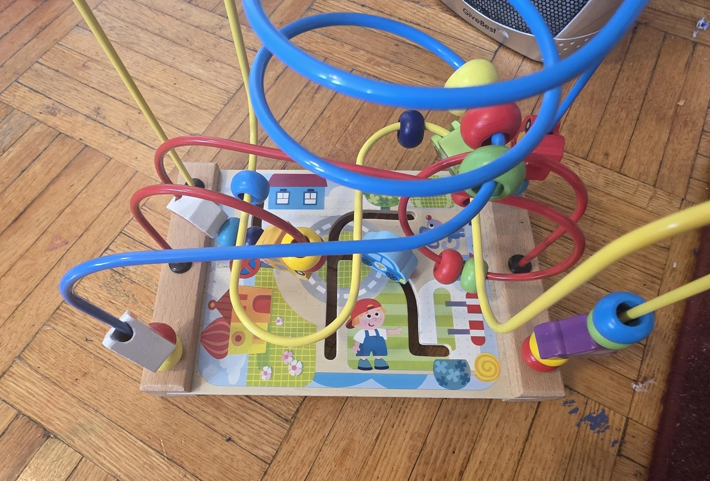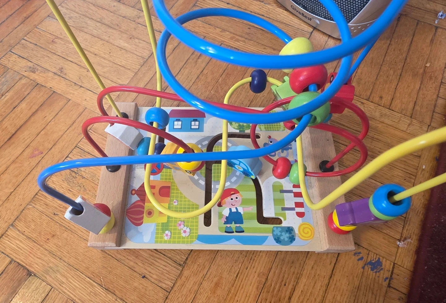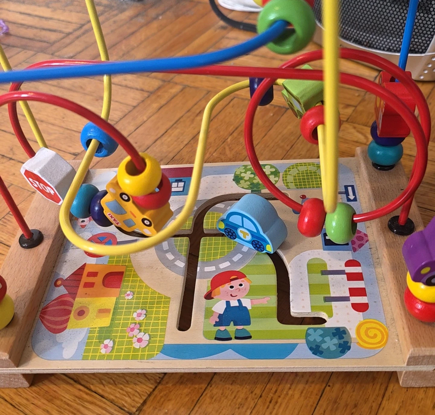 This wooden bead maze activity cube is designed for little ones. It features colourful beads, cars, and a fun playground scene. Great for developing fine motor skills!