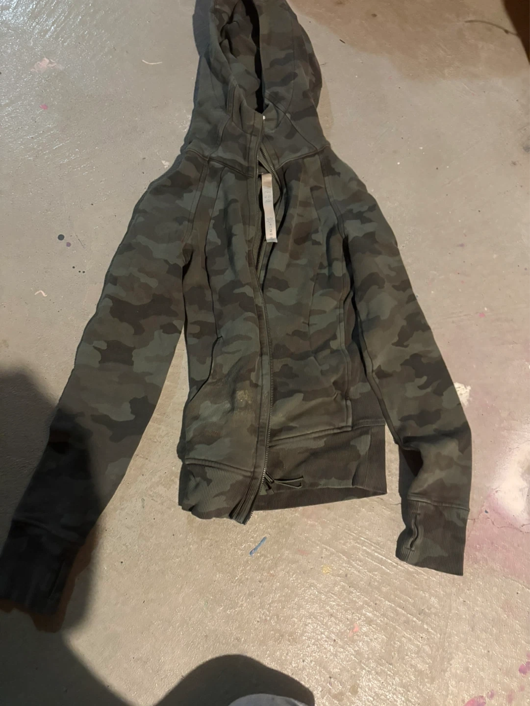 Lululemon zip up in a camouflage pattern. Designed in Vancouver. Made in Vietnam. Full zip closure with pockets.