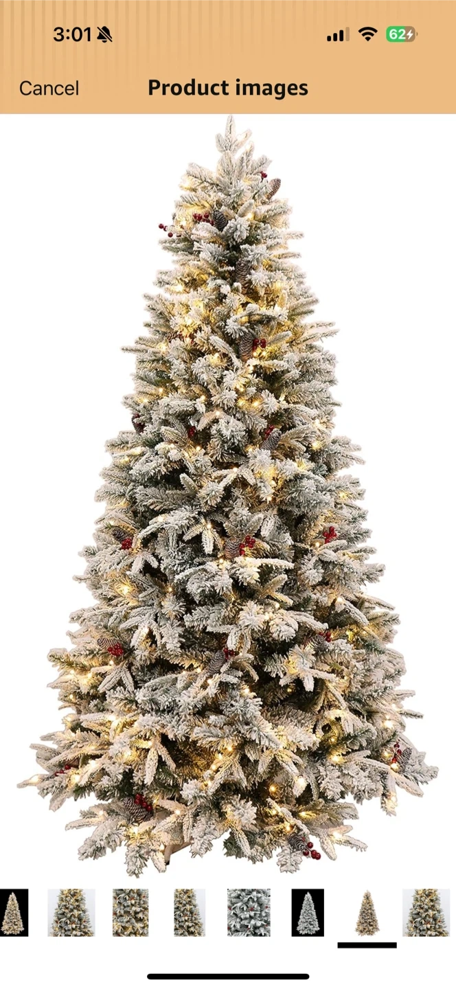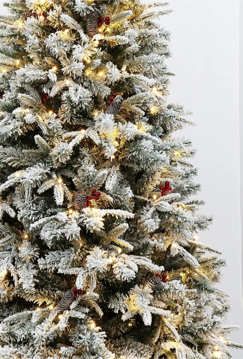 A festive flocked artificial Christmas tree pre-decorated with warm white lights and red berries. It's dusted with a snowy effect and includes pinecones for a rustic winter look. This tree's ready to be the centrepiece of your holiday decor!