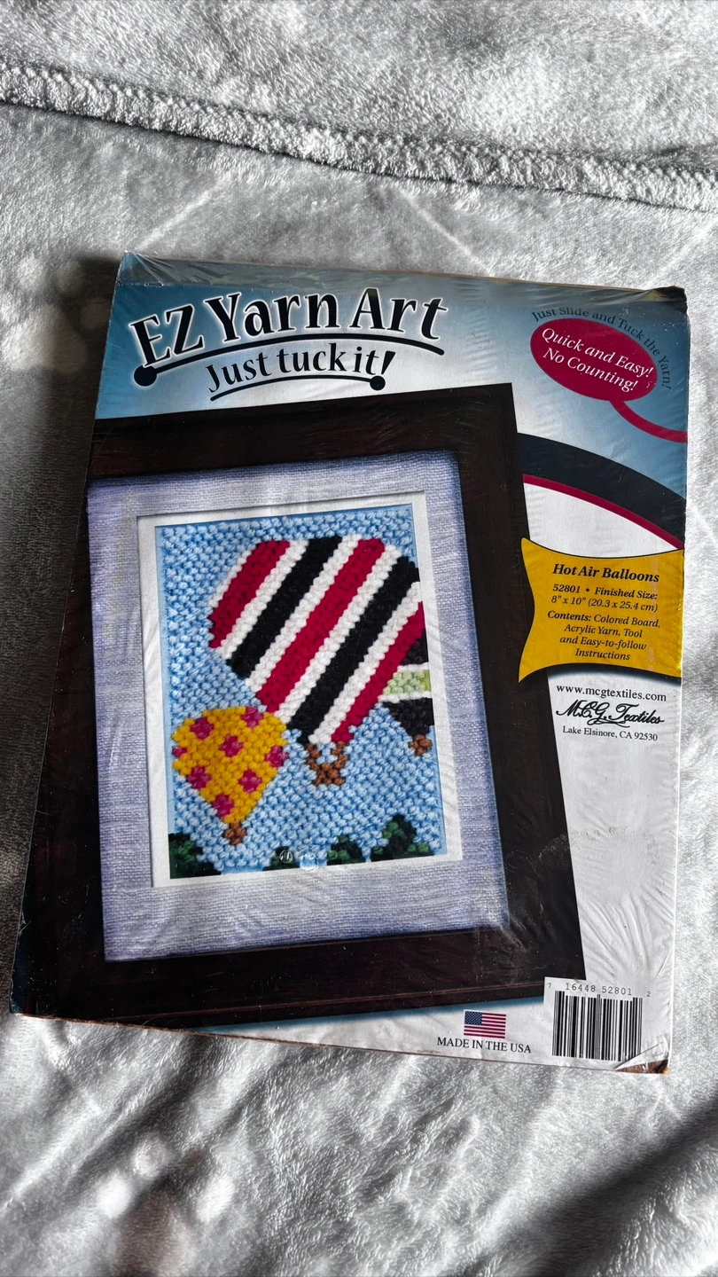 I'm selling an EZ Yarn Art Just Tuck It! kit for creating hot air balloon art. It's still sealed in its original packaging. The finished size is 5" x 7" (12.7cm x 17.8cm). The kit includes colored board and follow instructions. Made in the USA