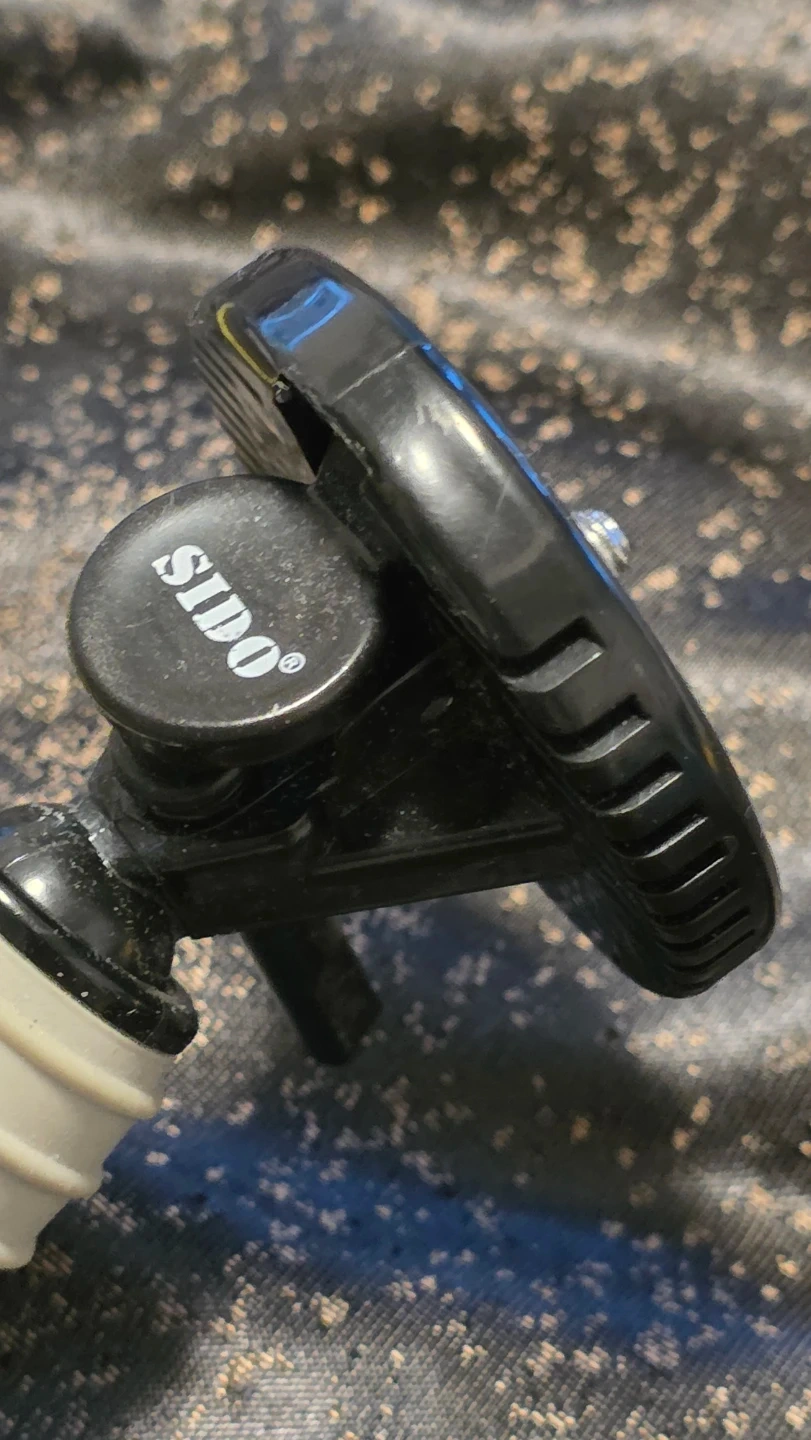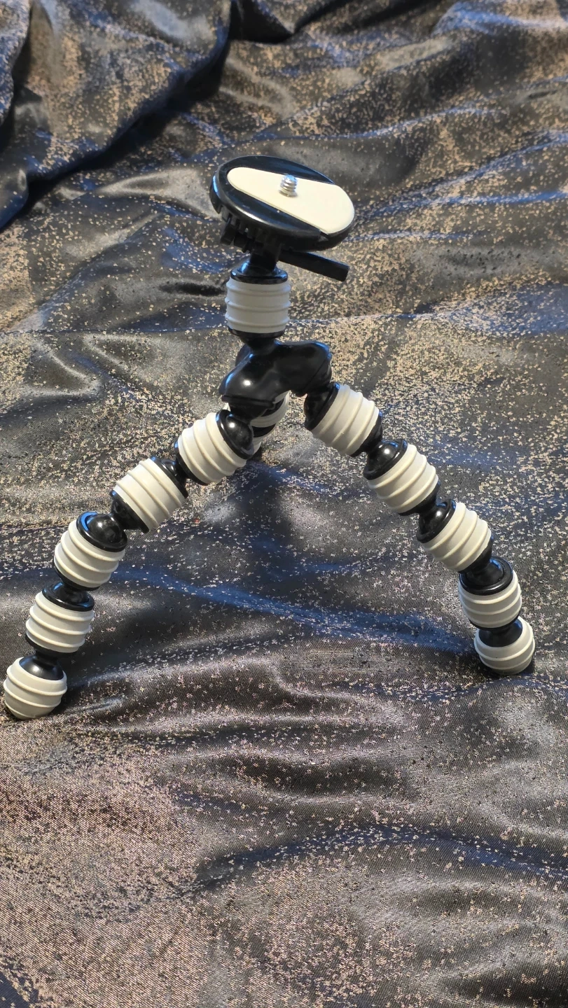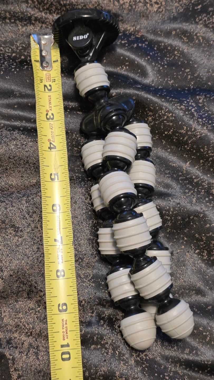 This is a Sido flexible tripod. It's black and white with articulated legs. The approximate height when extended is 8 inches.