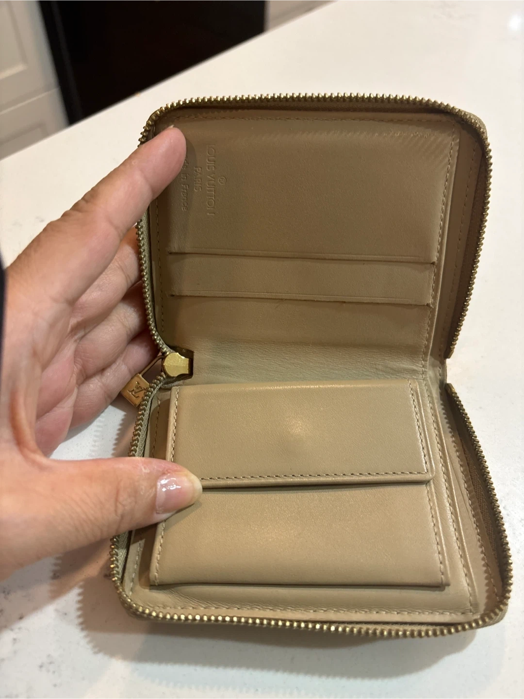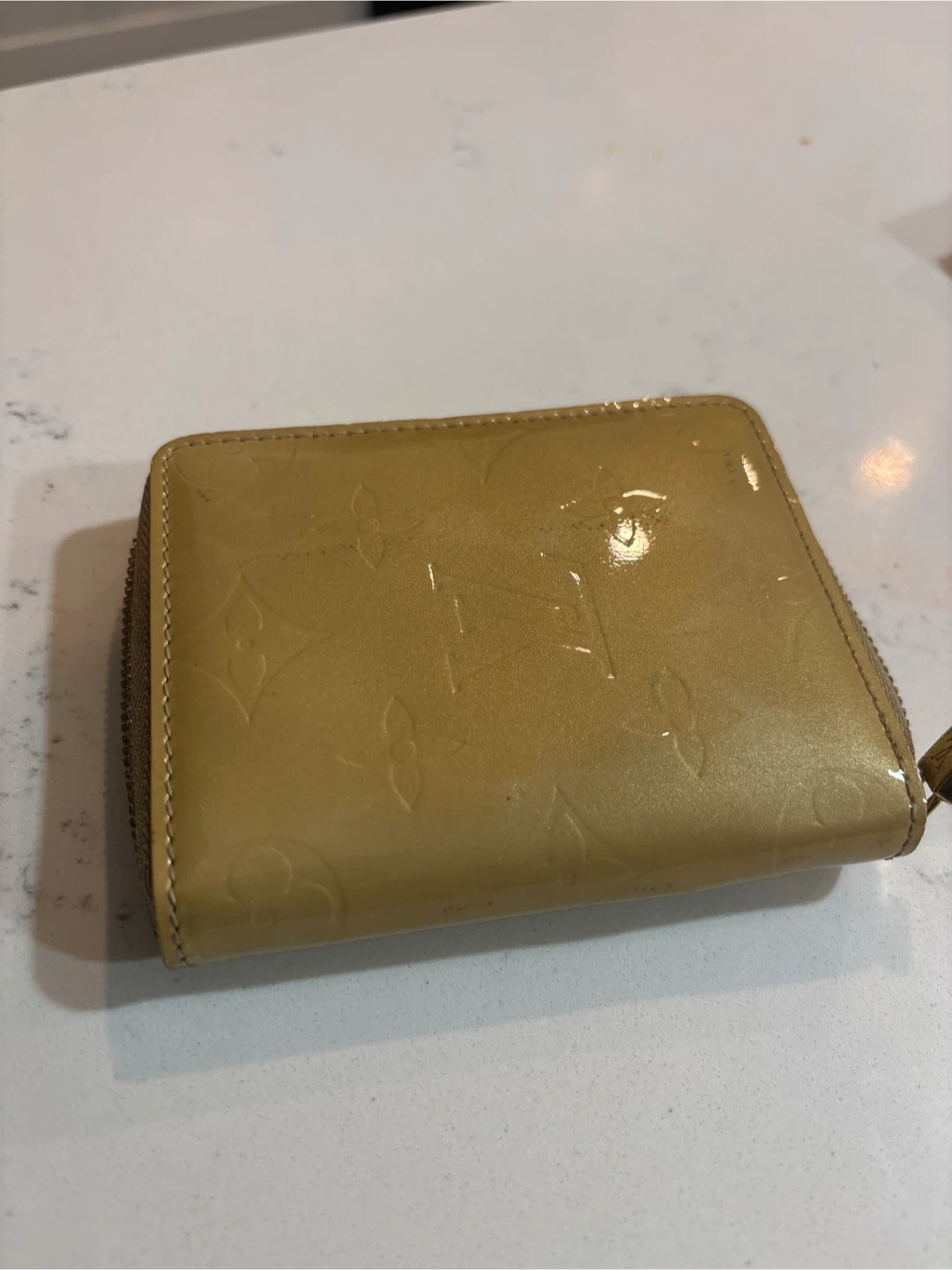 This is a Louis Vuitton Monogram Vernis Zippy Coin Purse. It's crafted from patent leather with the signature LV monogram. Inside, it features card slots and a coin compartment. It's a compact accessory for your essentials.