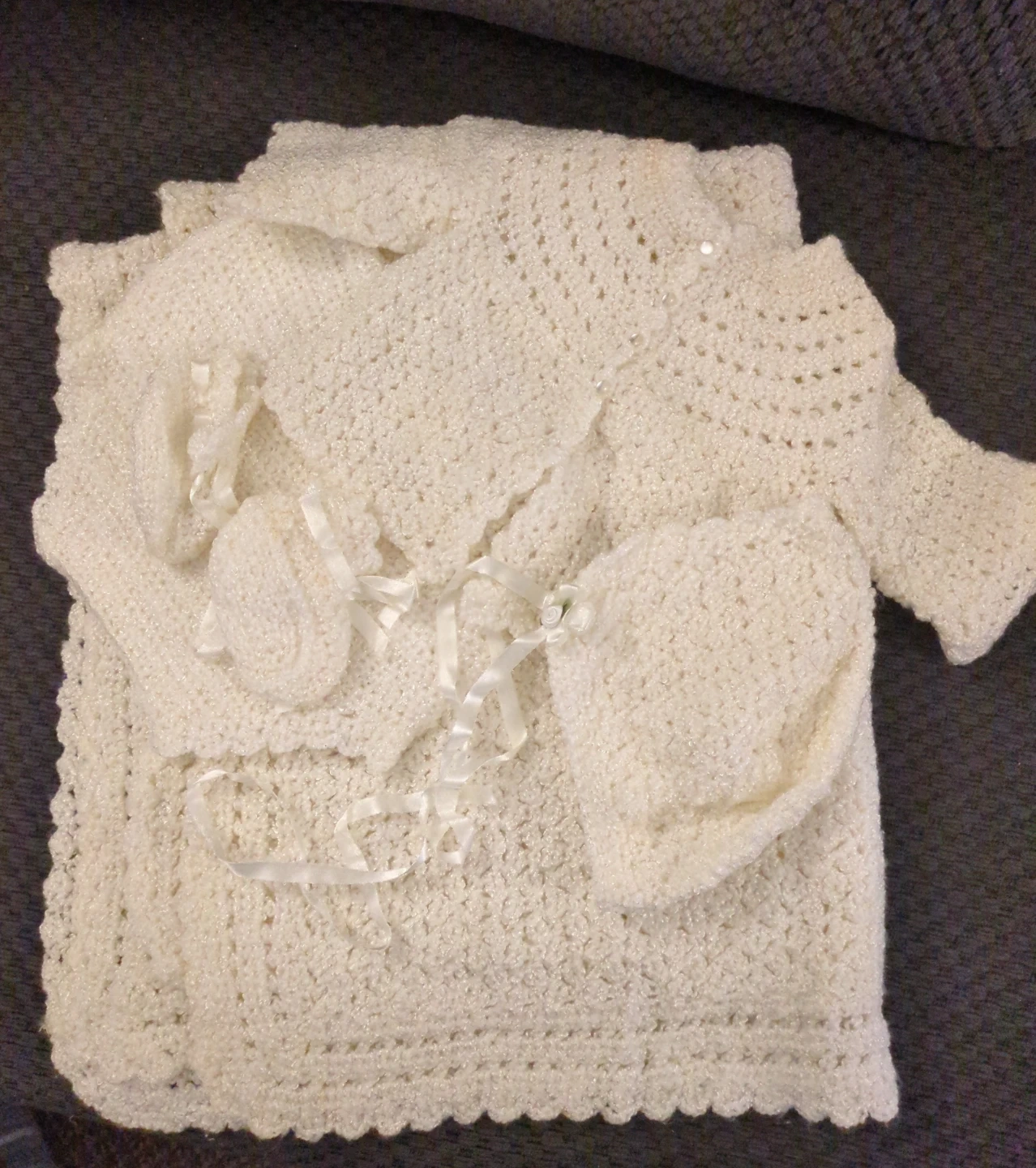 A cute, hand-knitted baby outfit in cream colour, perfect for keeping your little one cozy! The set includes a blanket, sweater, hat and booties. It has a delicate, handcrafted feel and is in excellent condition.
