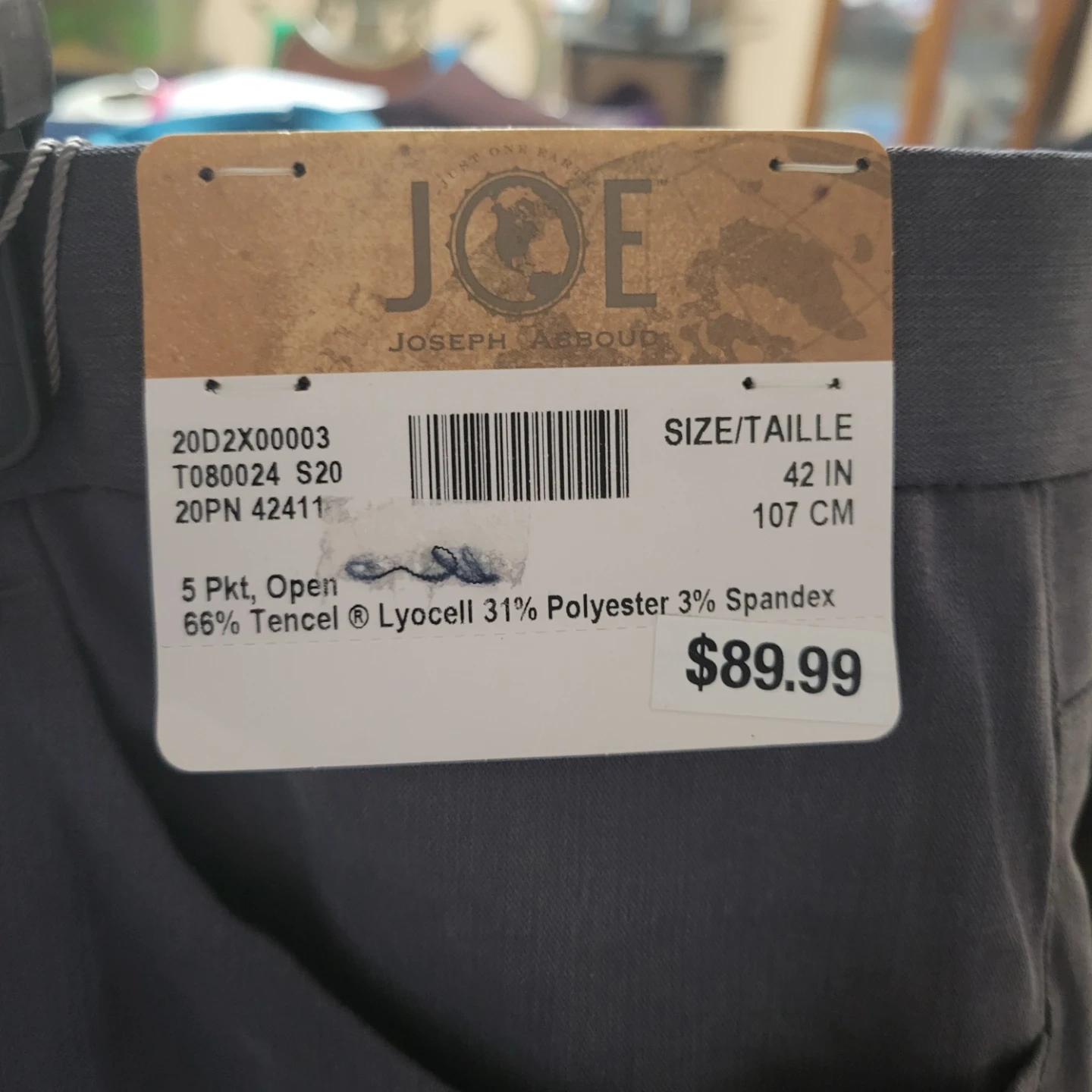 Here are some JOE Joseph Abboud dress pants in size 42. They are made of 66% Tencel Lyocell, 31% Polyester, and 3% Spandex. Originally bought for $89.99