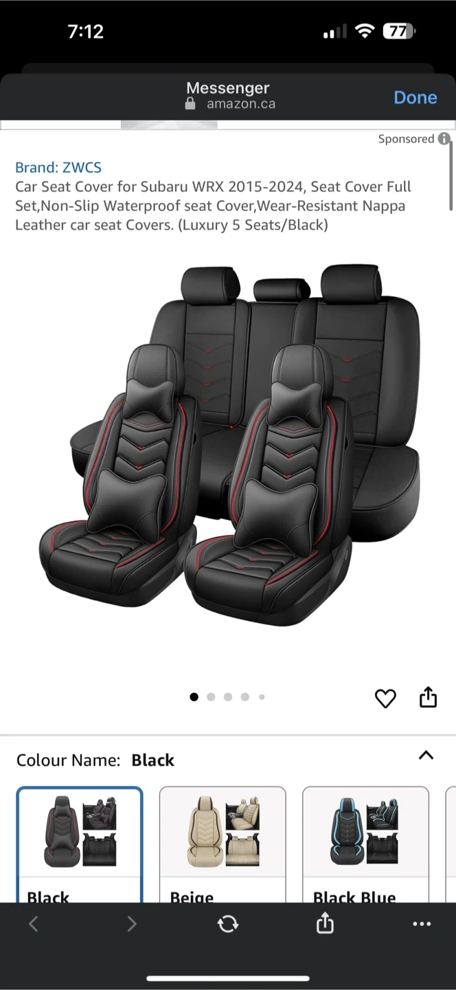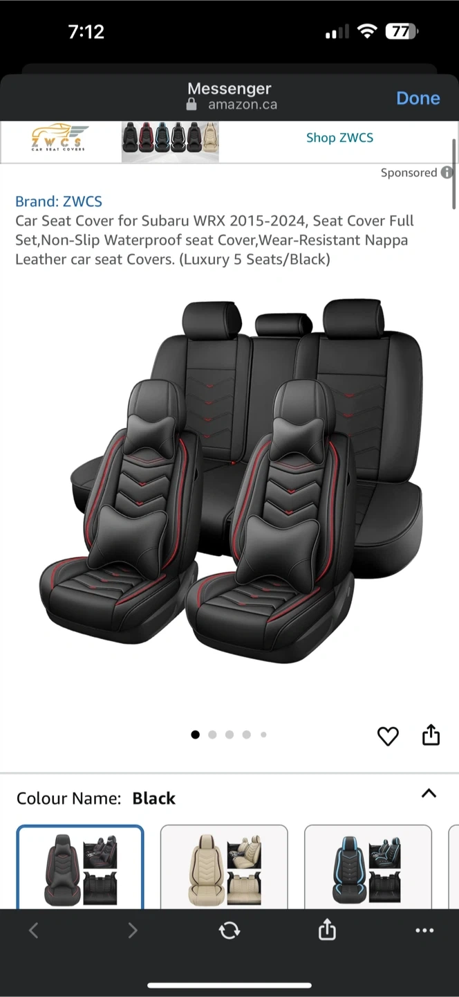 60Looking to sell a set of ZWCS car seat covers designed for the Subaru WRX models from 2015 to 2024! This is a full set with a non-slip, waterproof seat cover made of Nappa leather. It's a luxury 5-seat configuration in black. Originally retails for $268! It's brand new, my partner changed her mind and doesn't want to use it. Feel free to message for more question