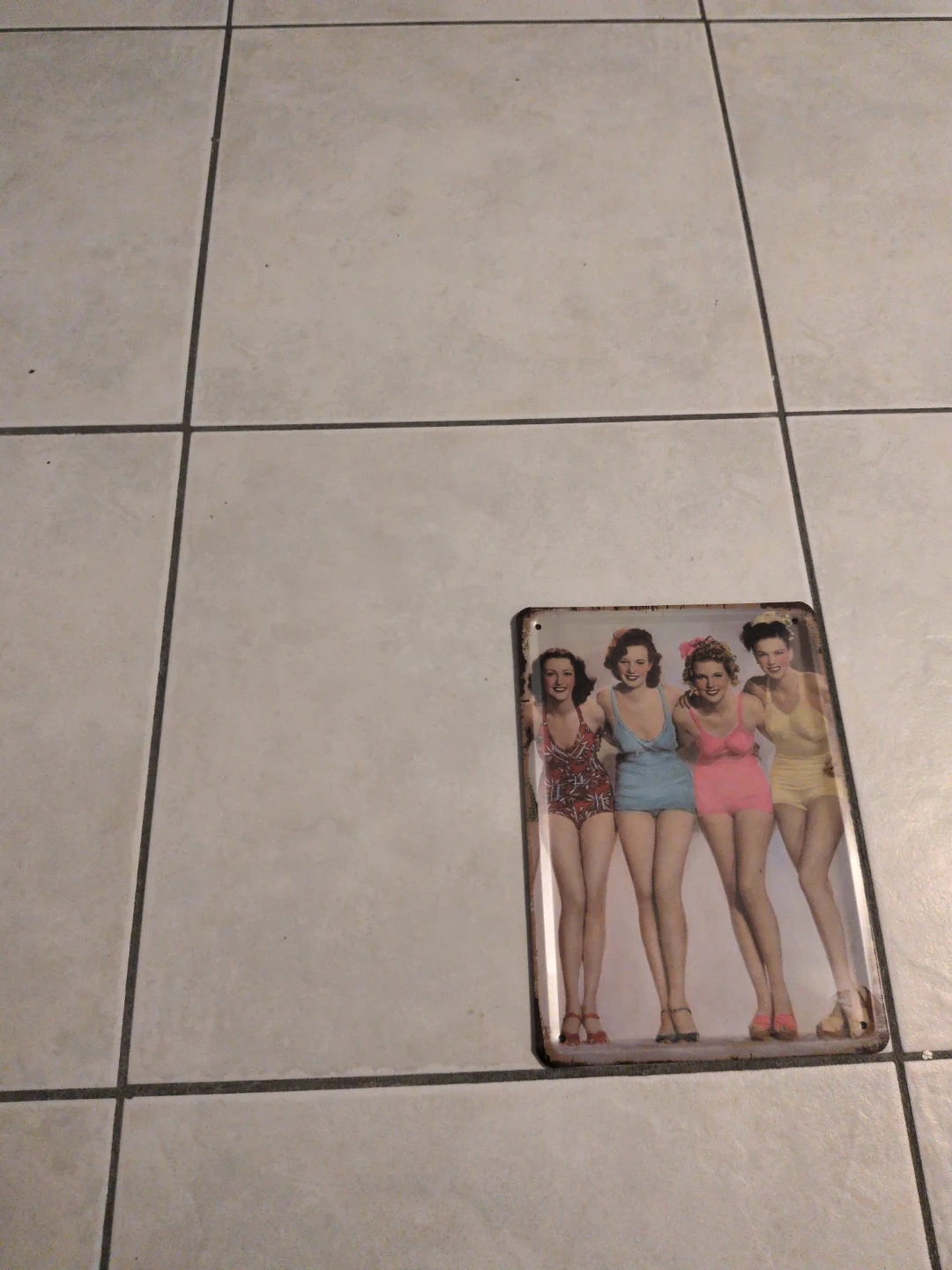 This metal sign features a vintage-inspired design with four pin-up girls in swimsuits. It's a fun decorative piece for any space. The sign is made of metal and has a retro feel.