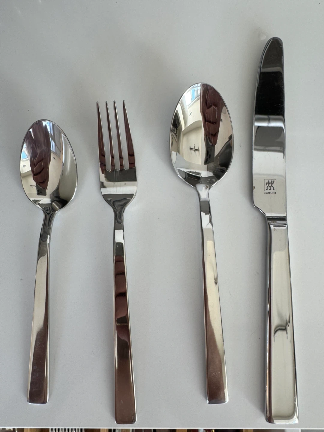 Selling a set of Zwilling J.A. Henckels flatware. It includes spoons, forks, dessert forks, tea spoons, 3 serving spoons The set also comes with reusable straws and chopsticks! Great for everyday use or special occasions!