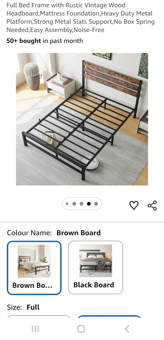 Full-size metal bed frame with a rustic vintage wood headboard. It's designed for heavy-duty support with strong metal slats. The frame is noise-free and easy to assemble. Only used for 1 year. Mattress is old but can be included for free.