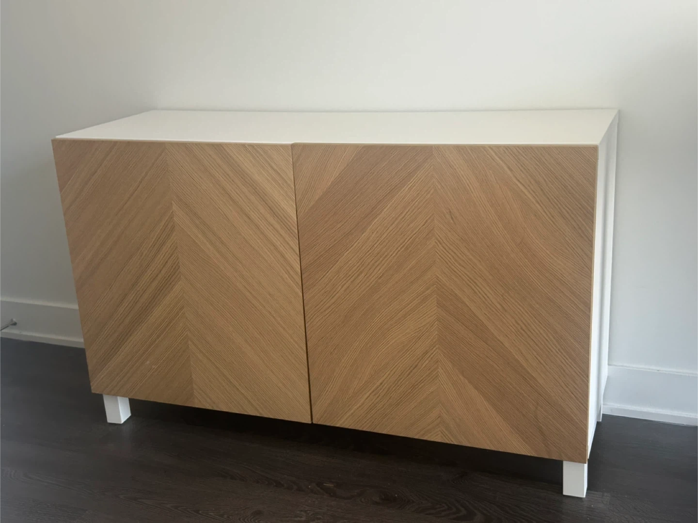 A stylish cabinet with white body and two wood-grain front doors featuring a chevron pattern. It has internal shelving for storage. This piece would be handy for organizing household items.