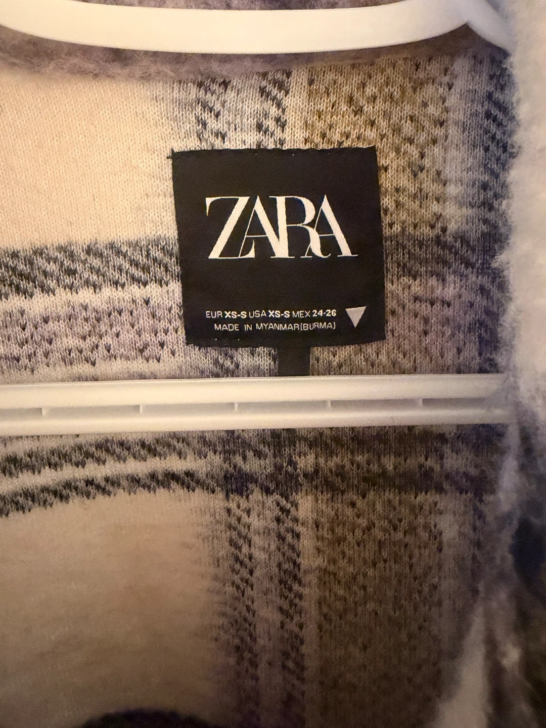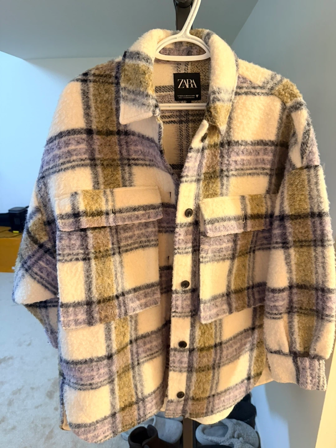 This Zara shacket features a classic plaid pattern. It's made from a cozy material. The size is EUR XS, USA XS, MEX 24-26. Very good condition like new