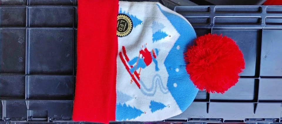 Fun ski-themed beanie! Has LED lights that cycle through different patterns, super cool for winter. Red, white, and blue with a fluffy red pom-pom. Great for slopes or just staying warm.