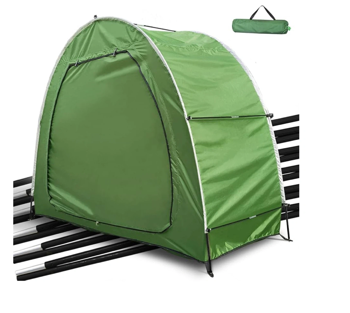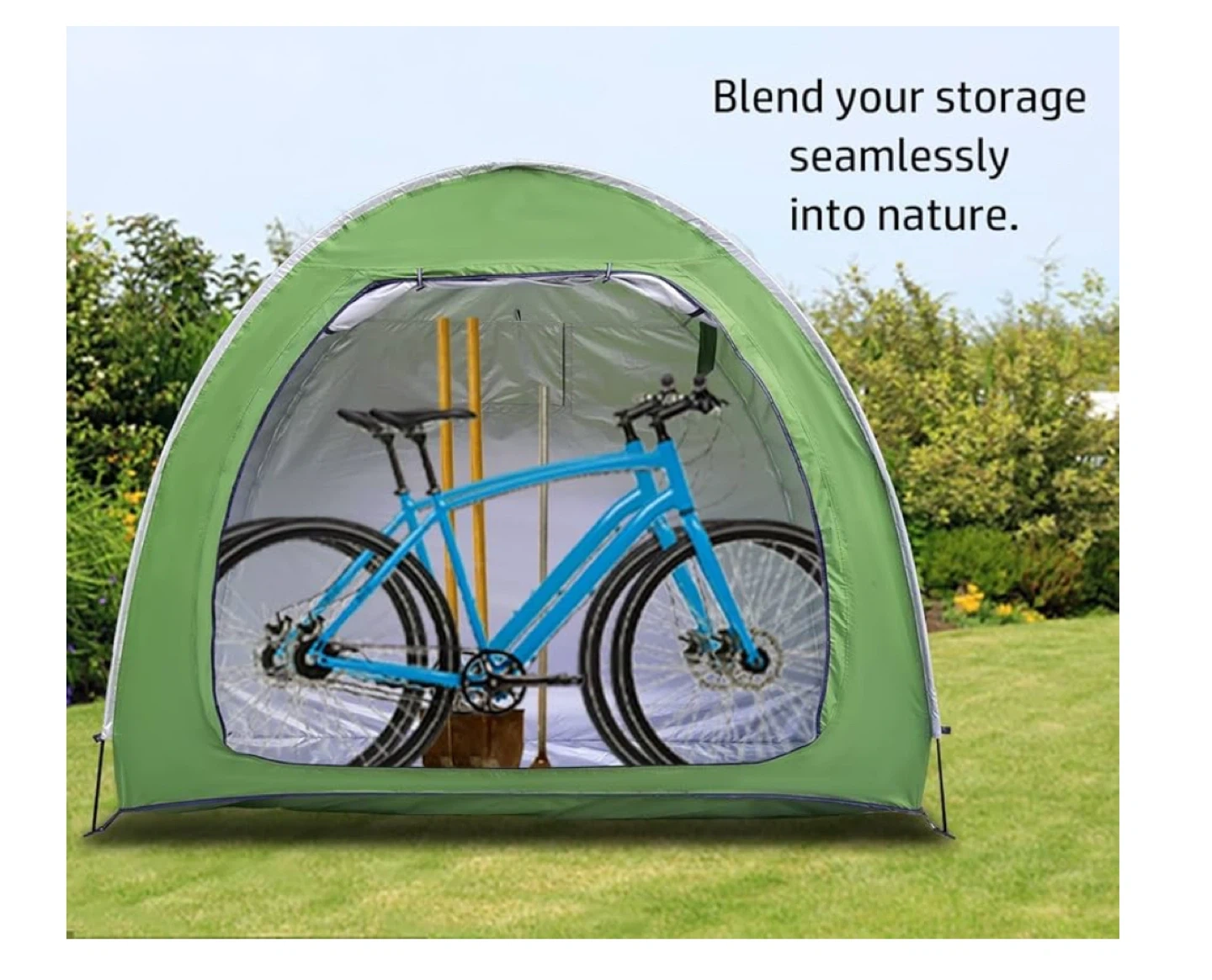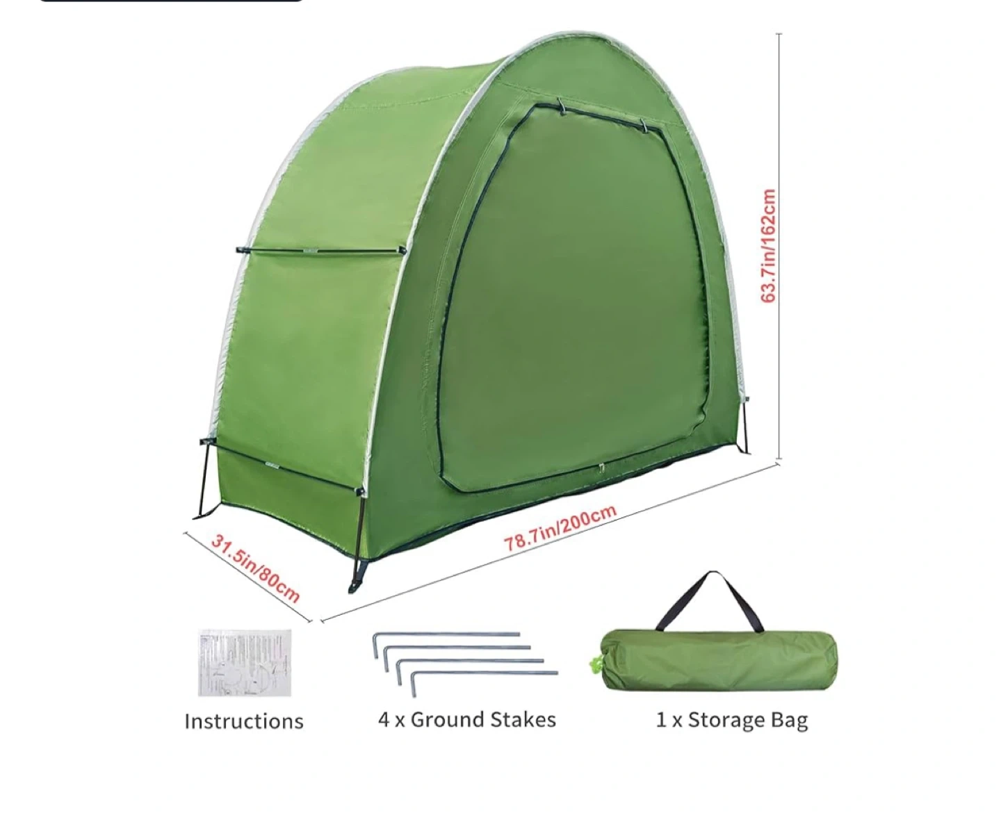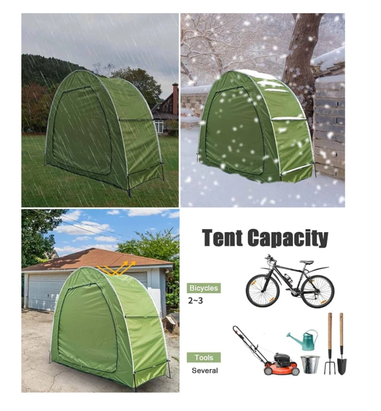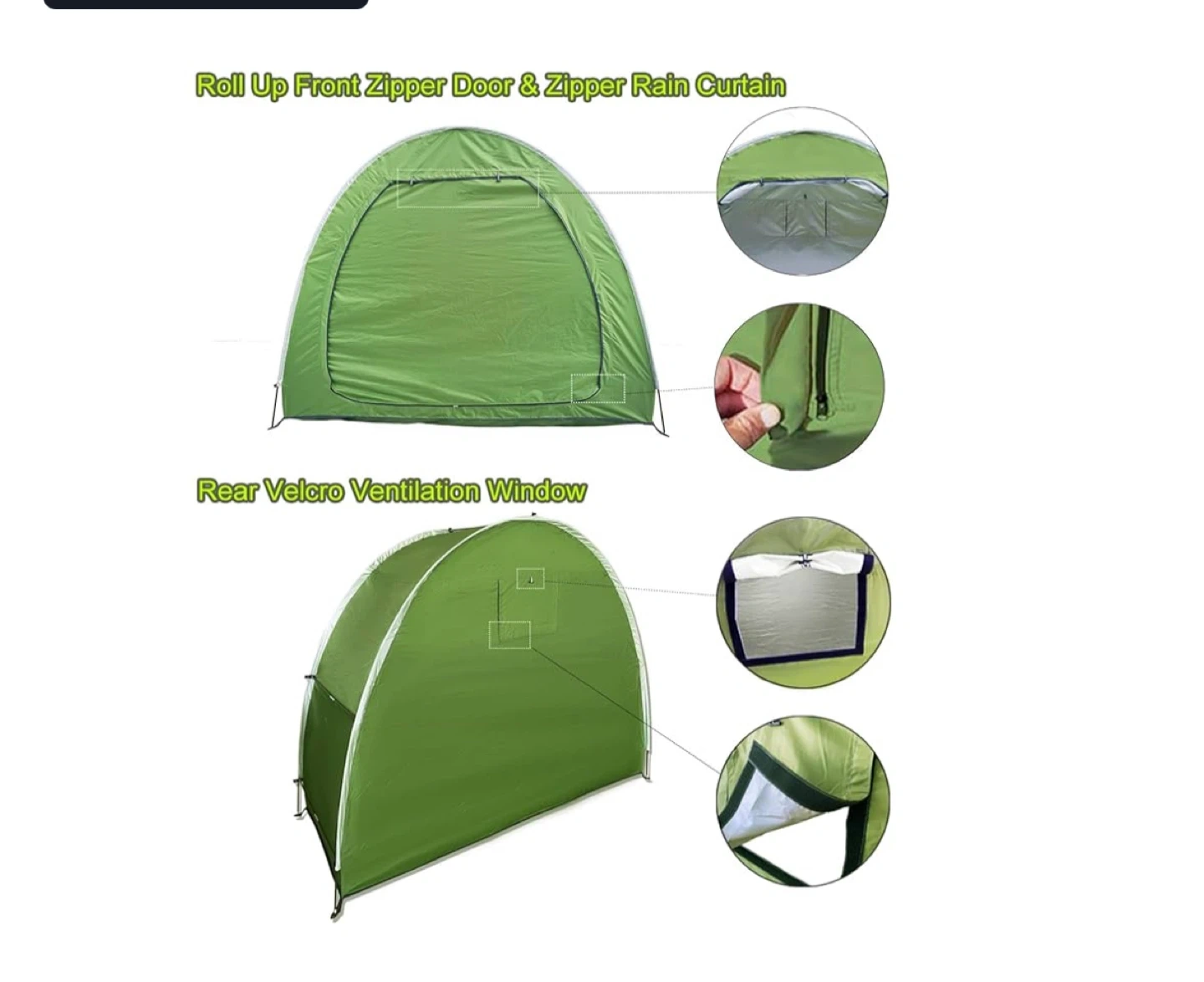 Keep your bikes or tools safe and dry with this brand new green storage tent! It's perfect for protecting your bicycles, lawnmowers, or other outdoor equipment from the elements.