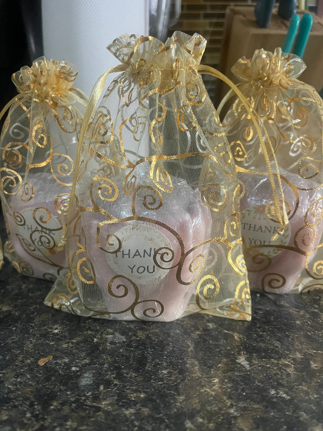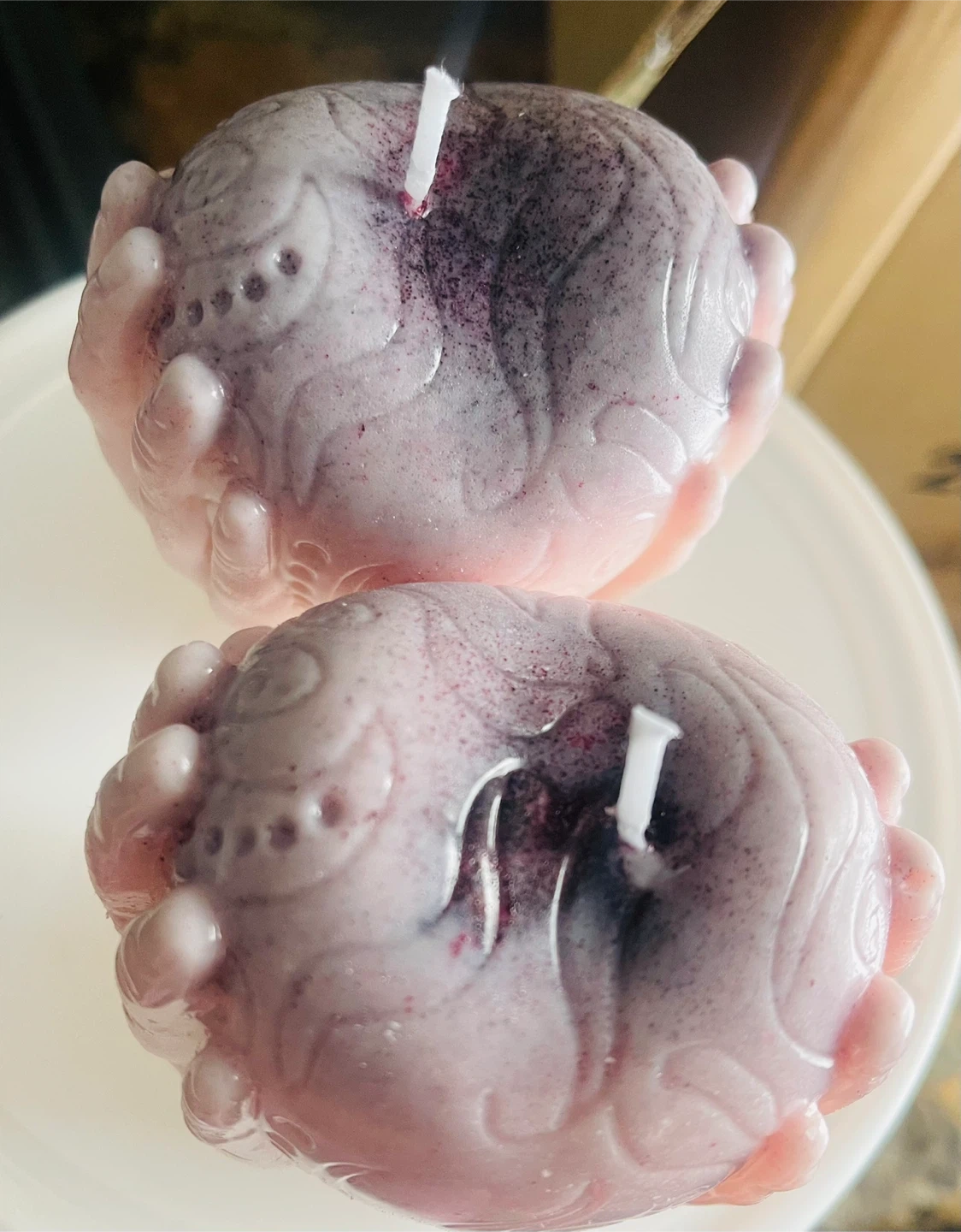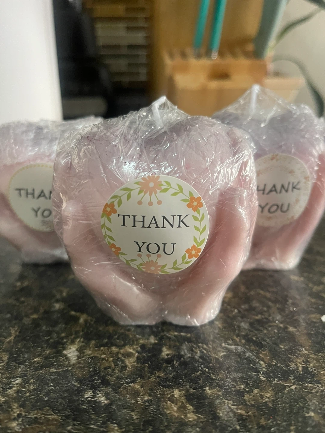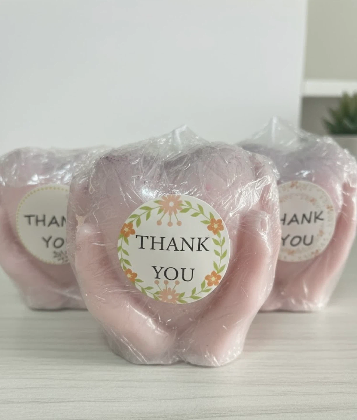 This unique candle is shaped like hands holding a heart. It's made of wax and comes in a beautiful pink and purple gradient. Perfect for adding a touch of charm to any room!