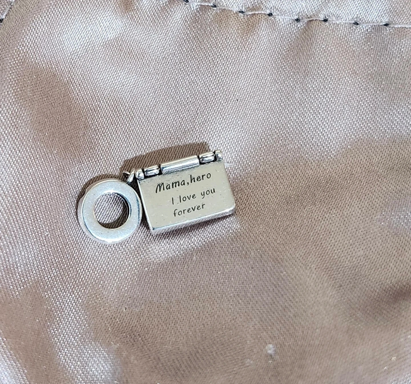 Sterling silver charm shaped like an envelope that opens. Engraved with "Mama, hero I love you forever" inside. This charm is perfect for expressing love to a mother. It's a thoughtful gift for any occasion!
