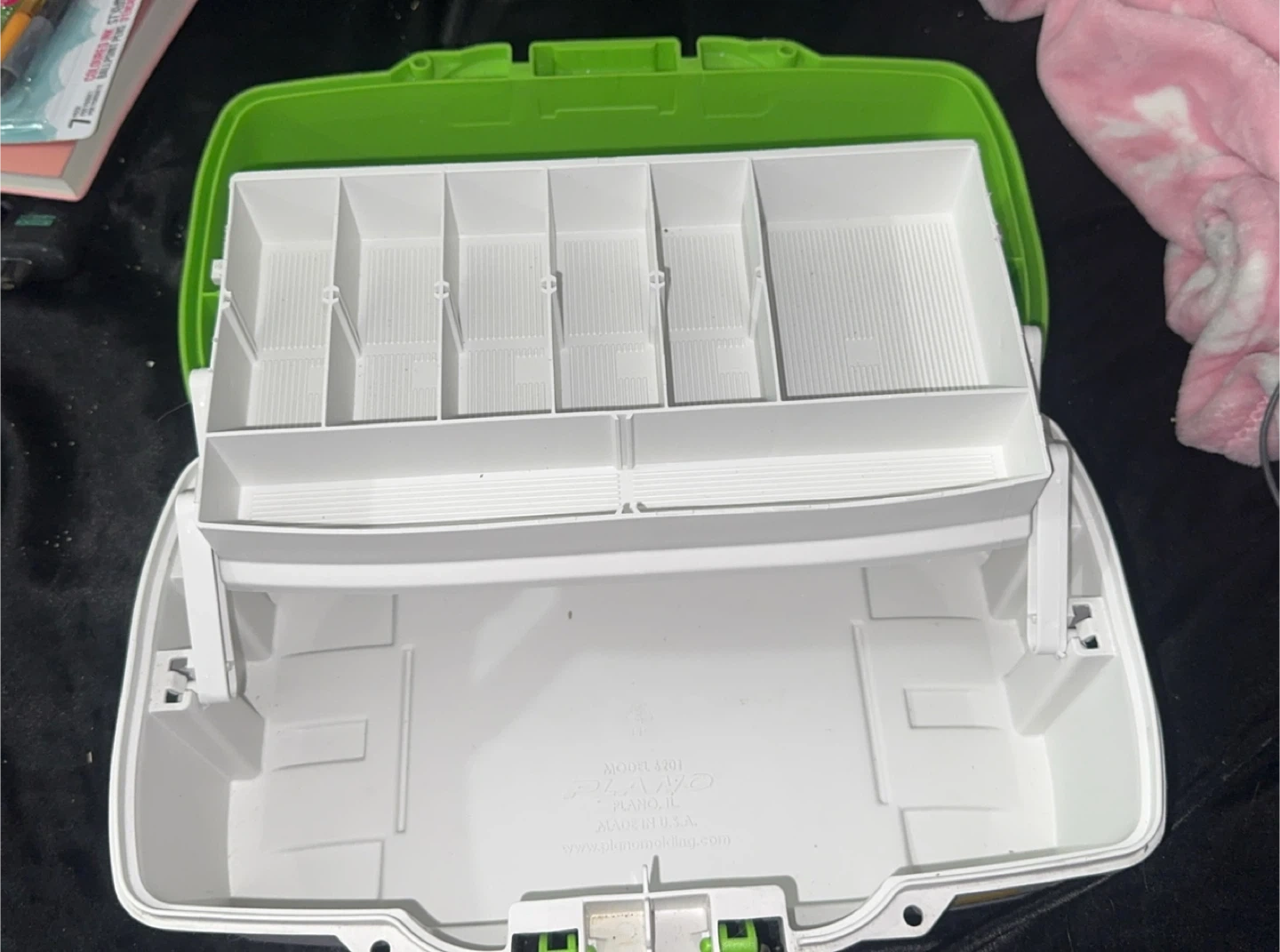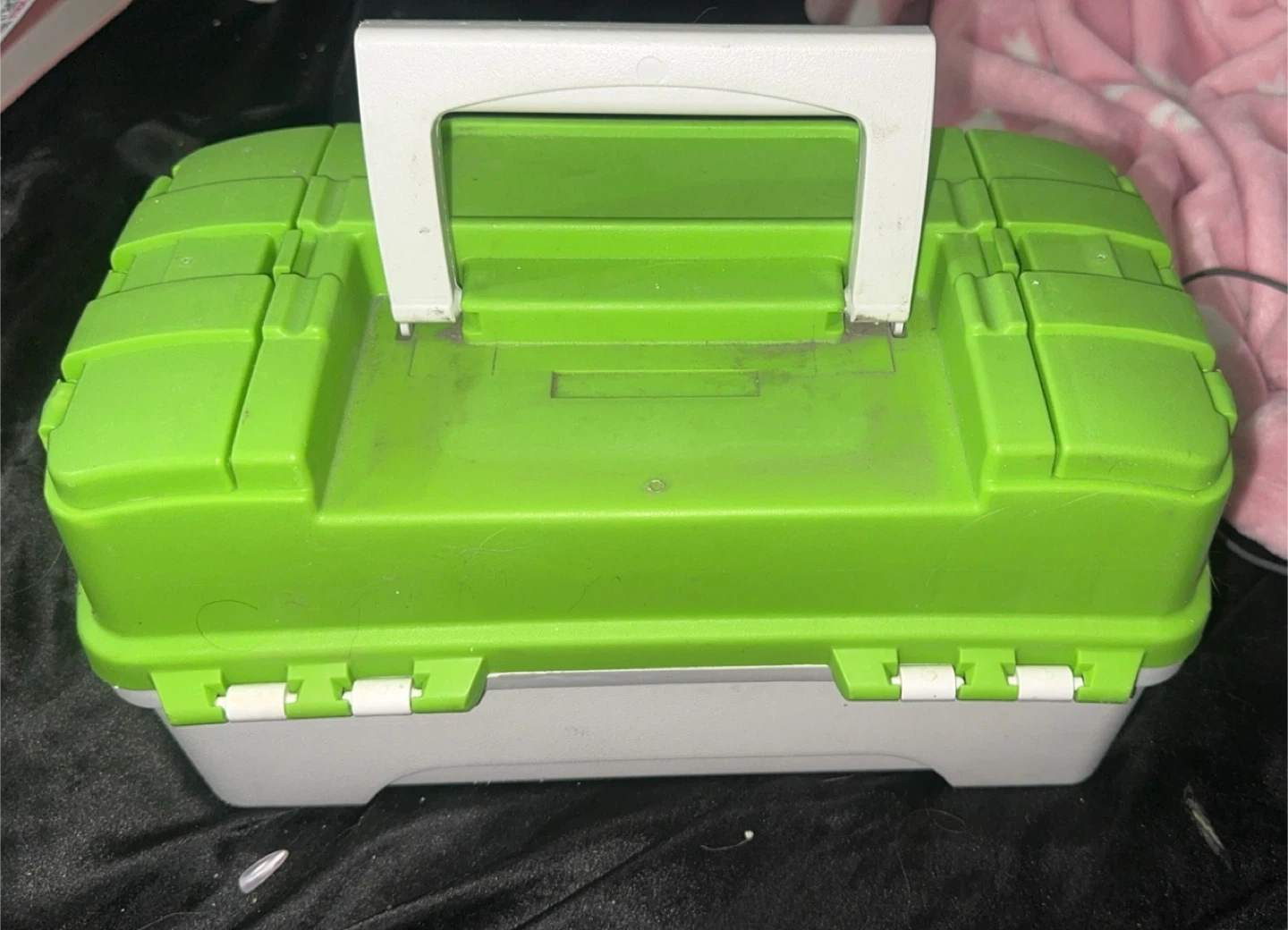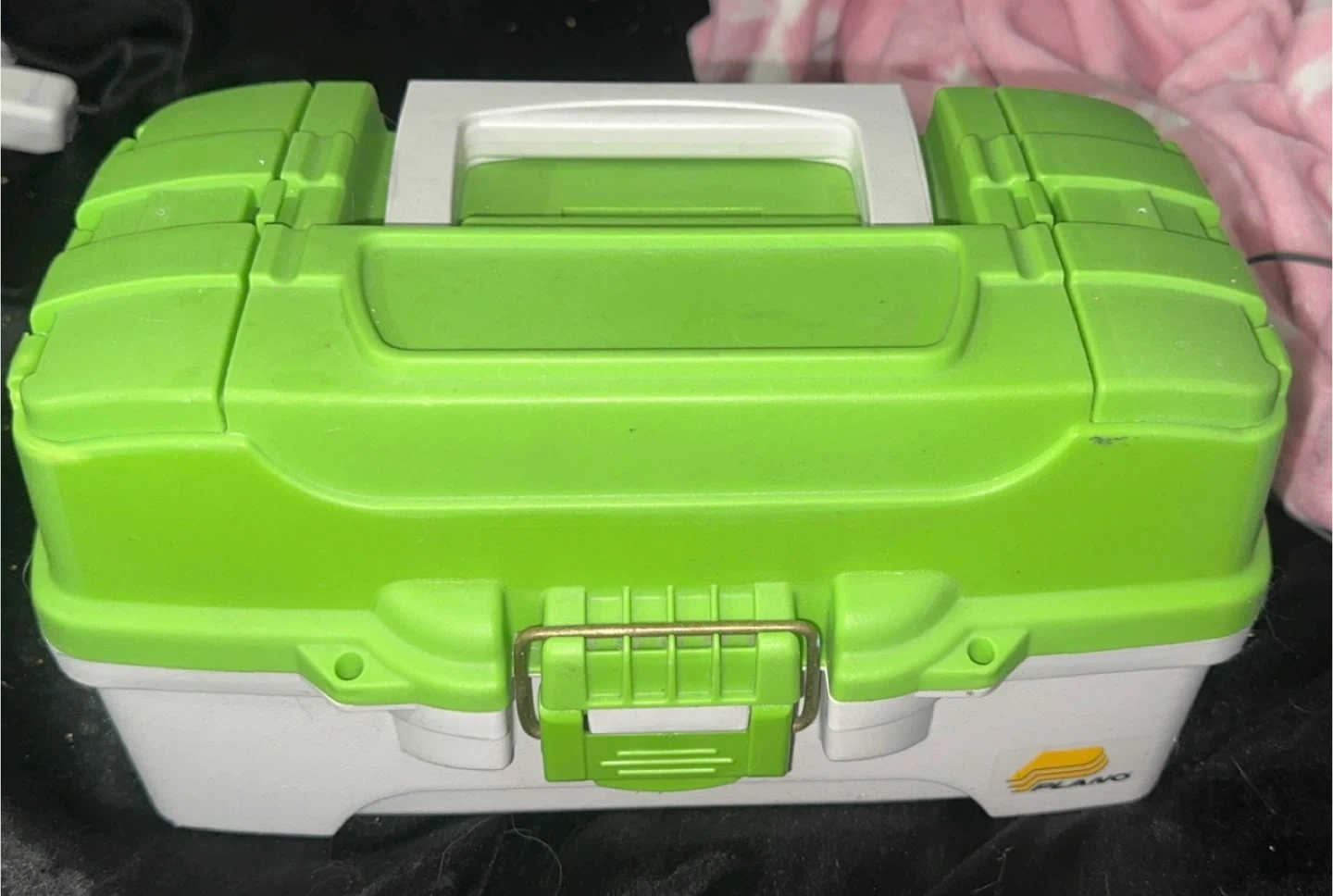 This is a Plano tackle box with a lime green and white exterior. It features multiple compartments for organizing tackle and gear. It's great for fishing trips!