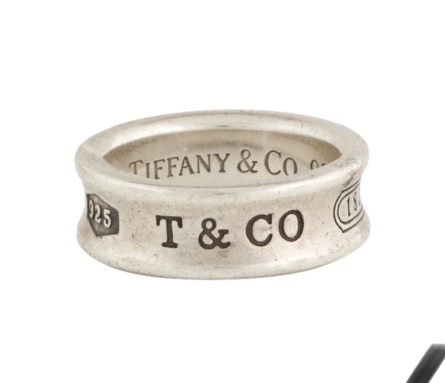 This is a Tiffany & Co. sterling silver ring. It's stamped with '925' and 'T & CO'. The ring has an internal inscription of 'TIFFANY & Co.' and '1837'.