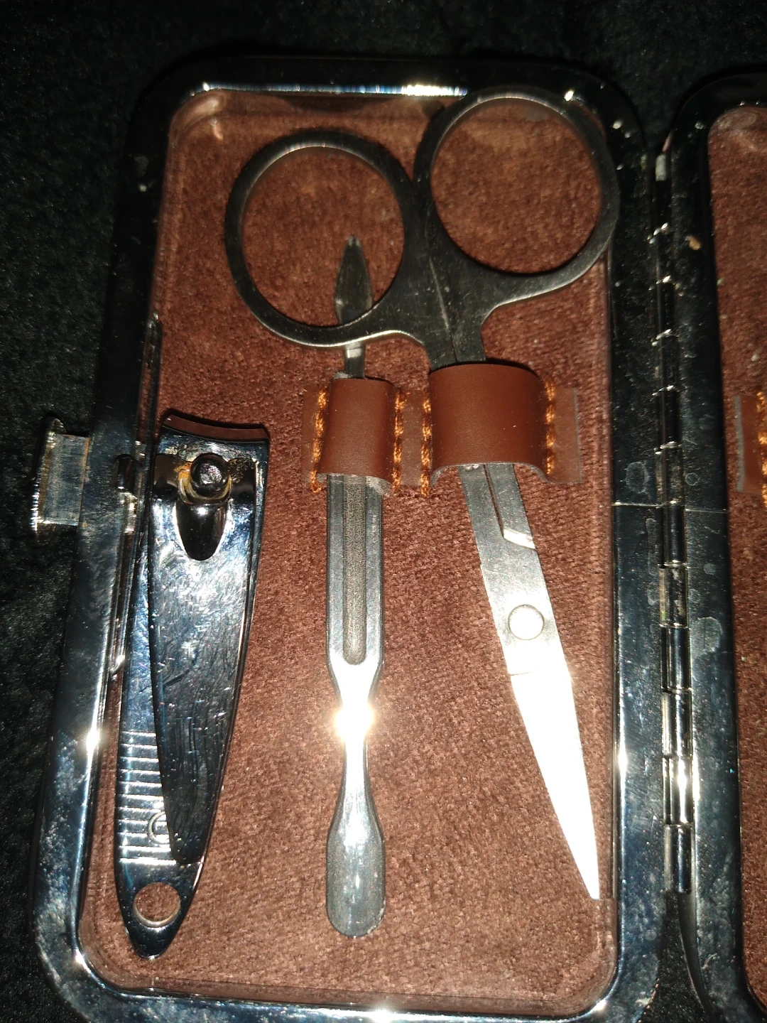 This is a beautiful small compact nail and cuticle kit it can work at home or out for travel it is all stainless steel, very clean and and in perfect condition.