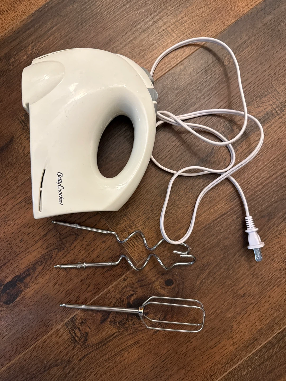 Betty Crocker white hand mixer. It comes with 3 sets of beaters for different mixing tasks. This appliance is handy for whipping cream or mixing batter.