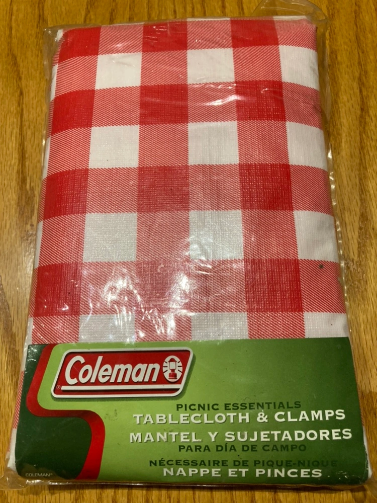 For your next outdoor picnic in windy Ontario. Red and white checkered tablecloth new in package. Clamps not available,