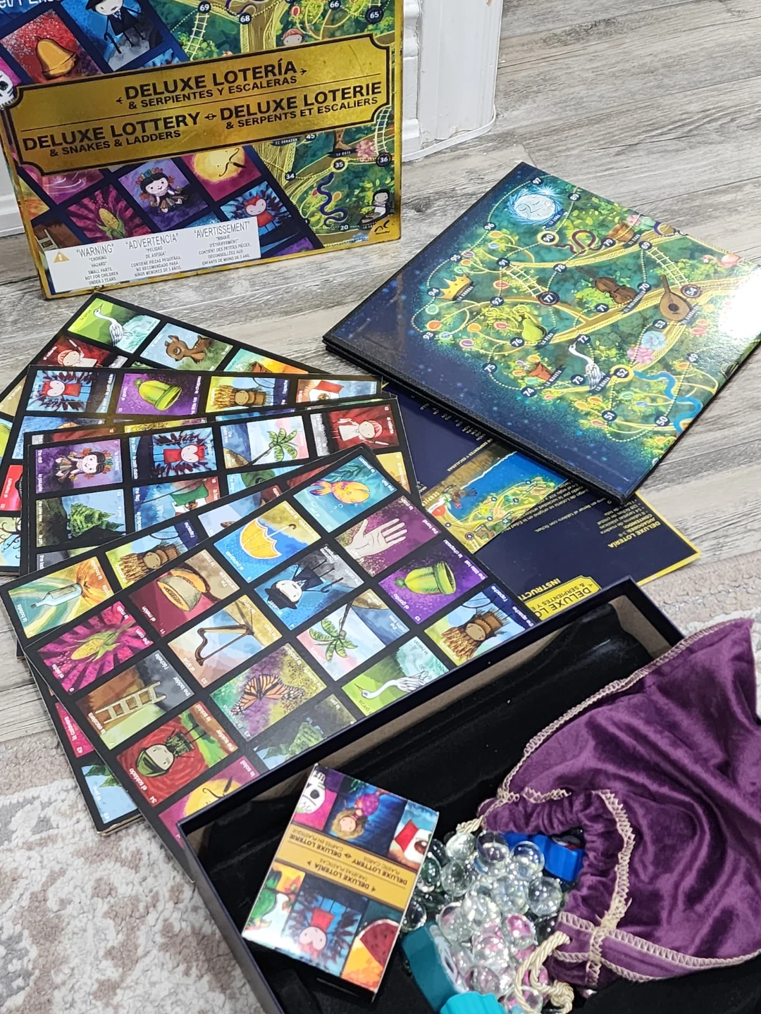 This is a Deluxe Loteria game combined with Snakes and Ladders. It includes game boards, cards, and game pieces in a box. A fun game for family nights!