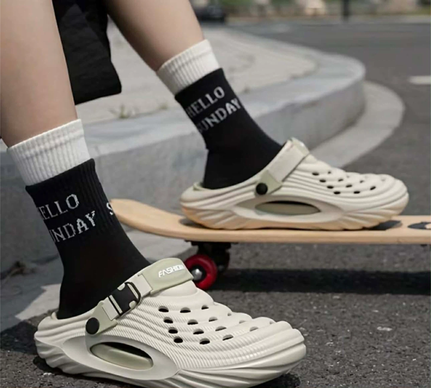 These light beige clogs feature a textured upper with a breathable perforated design. They have an adjustable strap with a buckle closure for a secure fit. Slip-on style for easy wear.